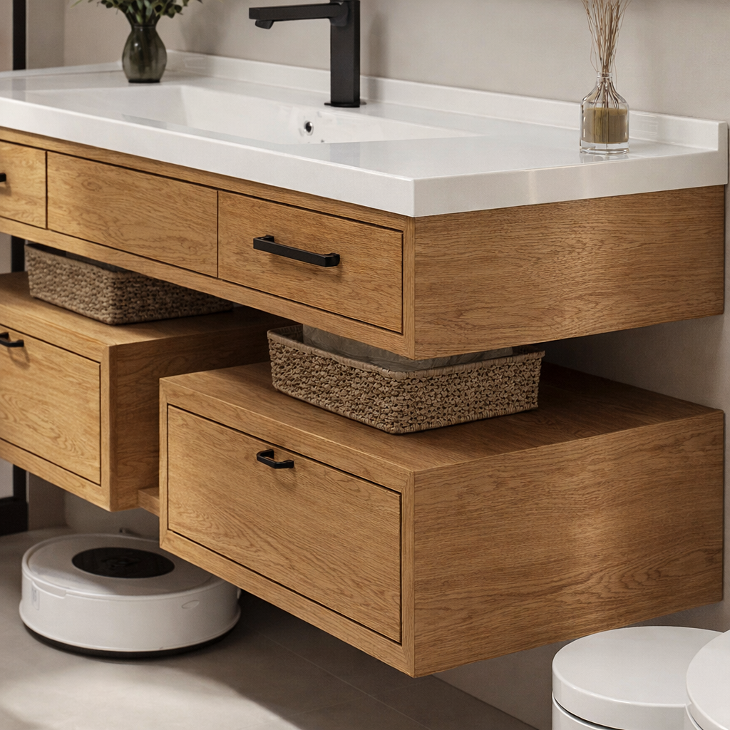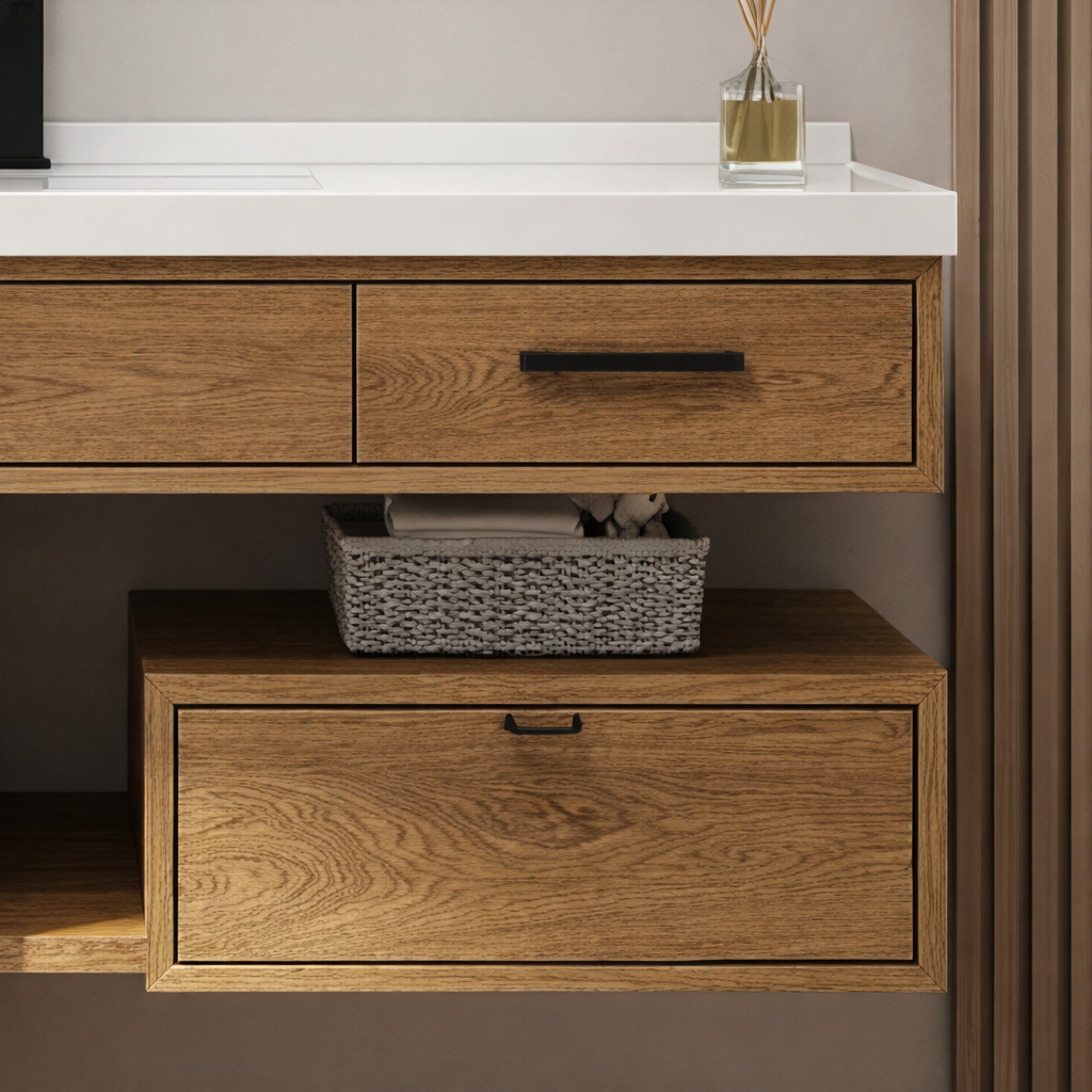 Natural variations in wood tone and grain may be visible and are part of the character of each piece. Appearance may vary slightly due to lighting and individual monitor settings. Sink and faucet are not included. Accessories and décor shown are for styling purposes only and are not included with the vanity.