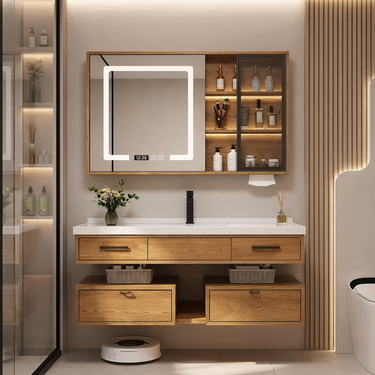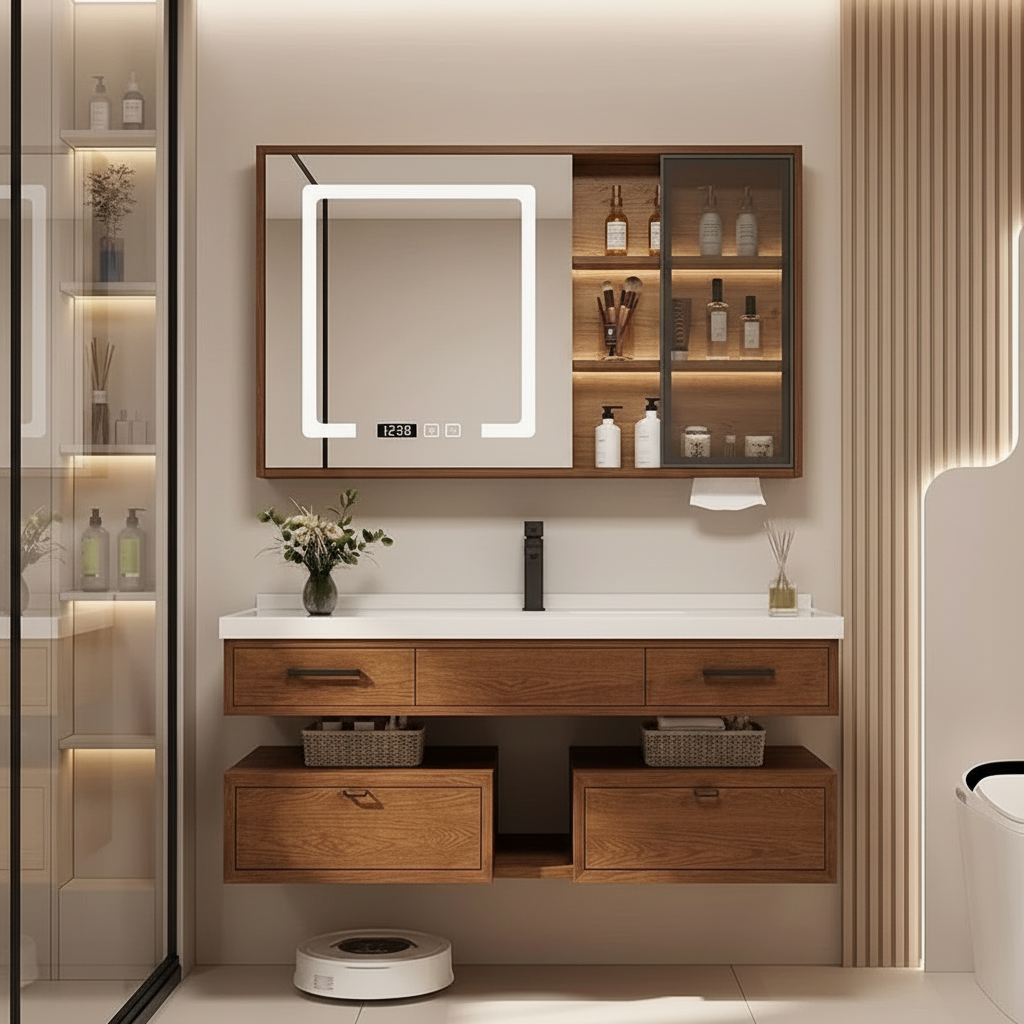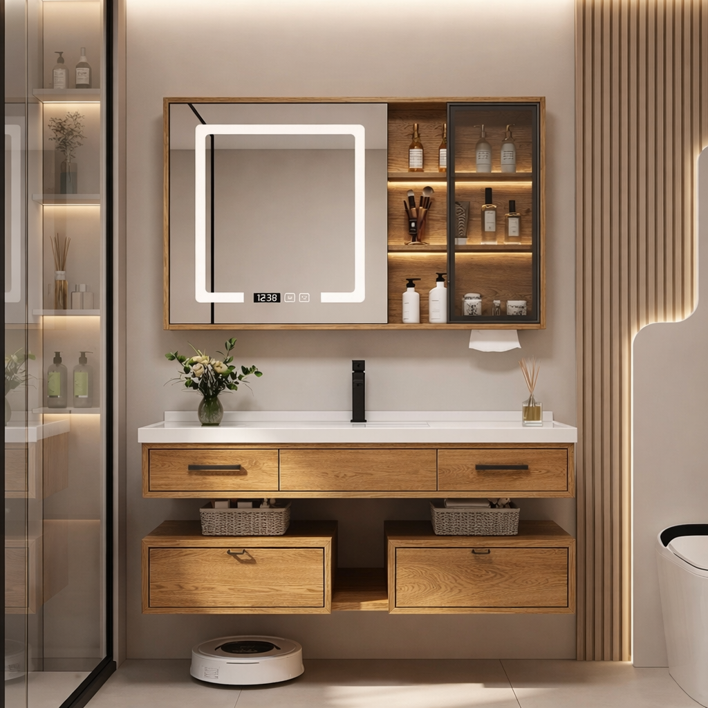 Bring a clean, calming look to your space with this Modern Wooden Bathroom Vanity Featuring Stone Look Countertop And Open Center Shelf For Bathroom. The streamlined silhouette adds warmth and balance, while the combination of concealed storage and open access helps keep daily essentials organized and easy to reach.