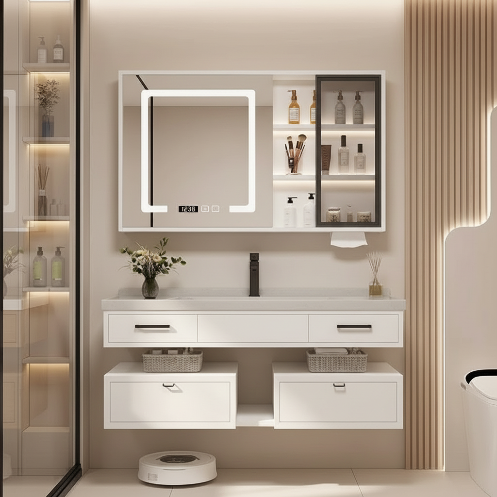 This bathroom vanity features a smooth stone-look countertop for a refined, spa-inspired feel. Pull-out drawer storage keeps toiletries and bathroom items tucked away for a clutter-free surface, while the open center shelf creates a convenient spot for baskets, folded towels, or everyday grab-and-go items. The freestanding profile offers a stable, grounded look that pairs well with warm neutrals and modern finishes.