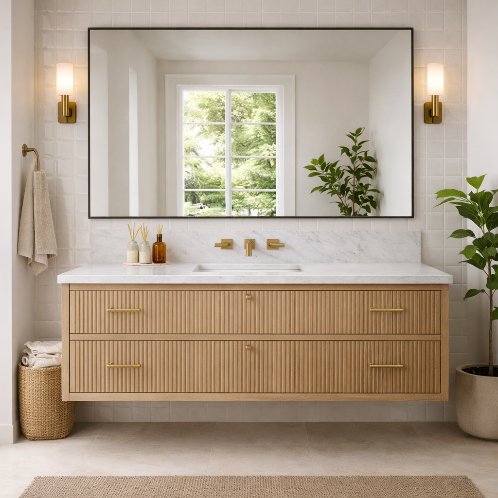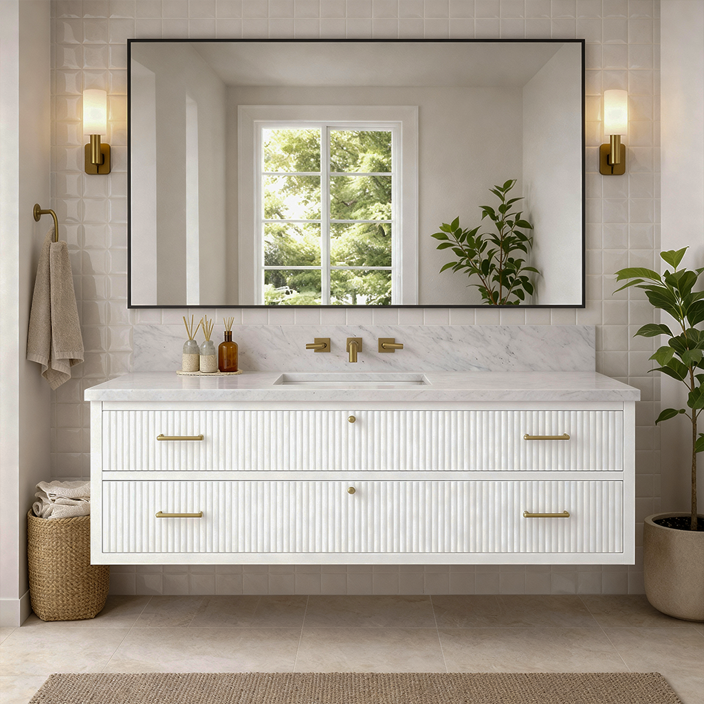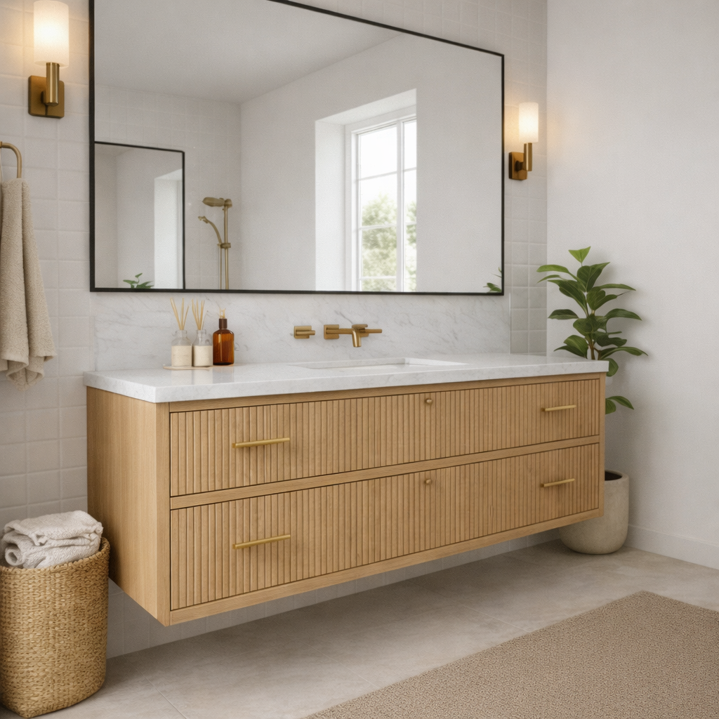 Add clean, wall-mounted storage with a refined, textured look using this Modern Wooden Bathroom Vanity With Fluted Drawer Fronts For Bathroom. Designed to keep daily essentials organized and easy to access, it brings warm wood tone and subtle vertical detailing to a bright bathroom while keeping the floor visually open and uncluttered.