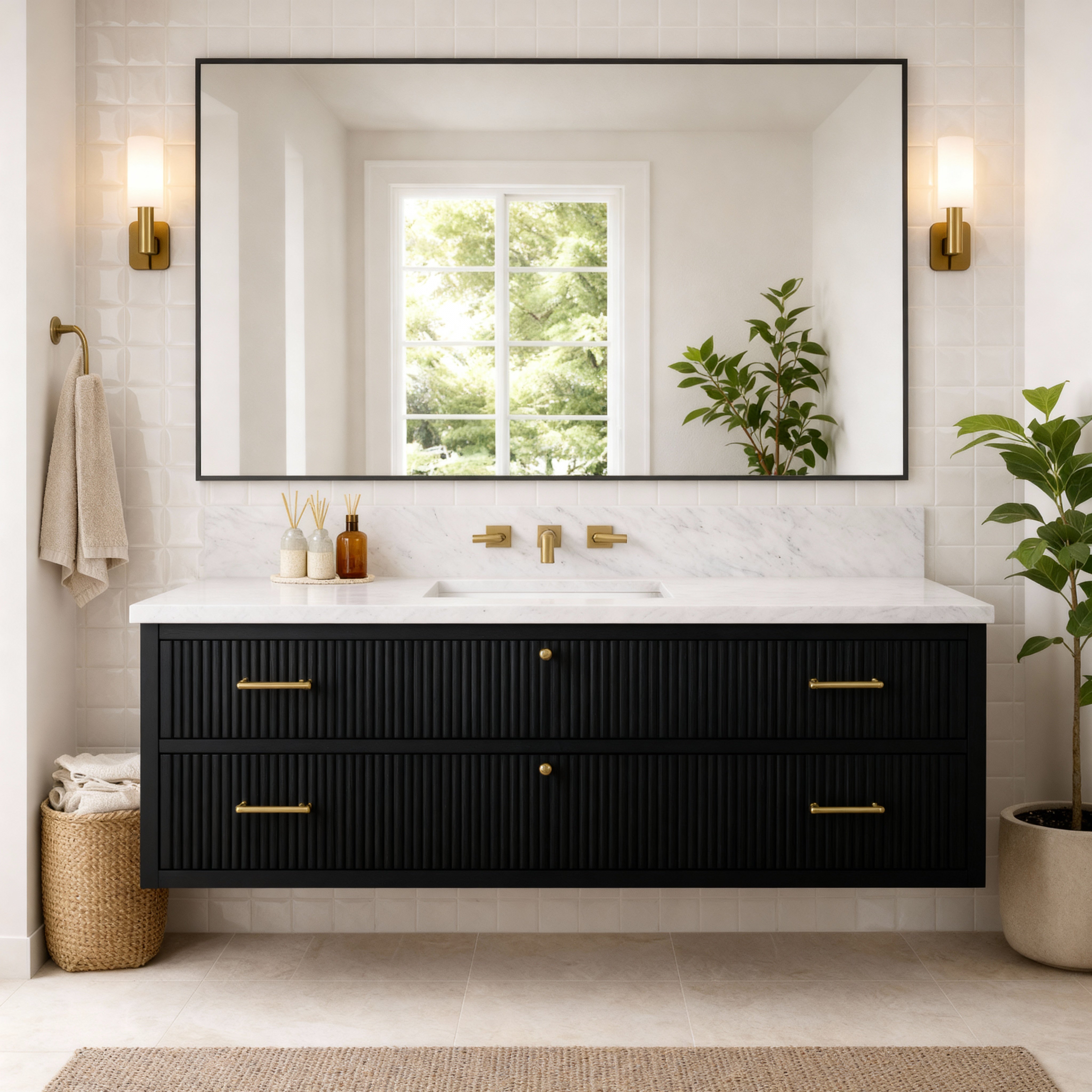 - Bright bathrooms with large mirrors and simple wall lighting
