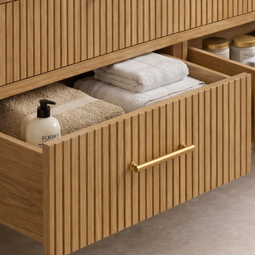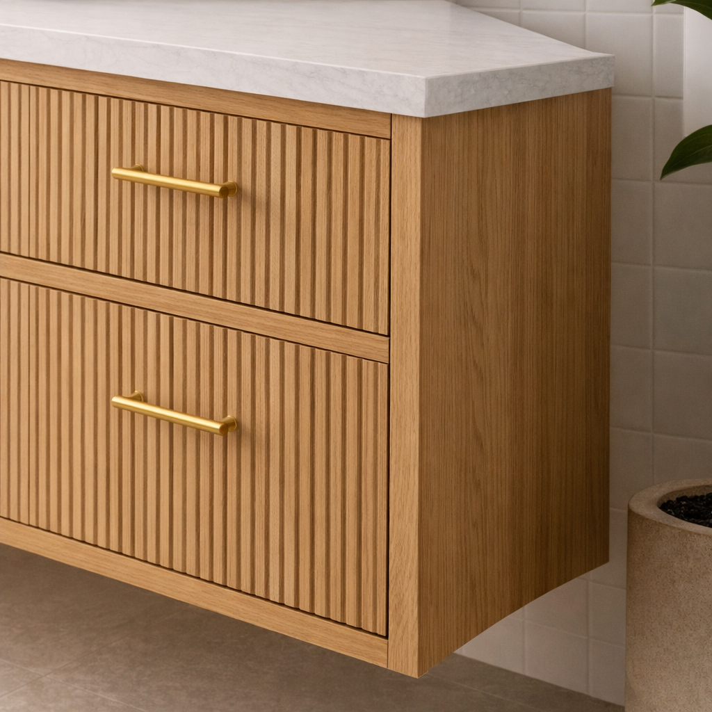 Modern Wooden Bathroom Vanity With Fluted Drawer Fronts For Bathroom features a sleek floating profile with wide drawers that provide concealed storage for toiletries and everyday items. The fluted front panels add depth and a tailored, architectural finish, while slim bar handles keep the look polished and easy to use. Its long, clean-lined silhouette pairs naturally with modern fixtures and minimalist styling, helping your bathroom feel calm, coordinated, and intentionally designed.