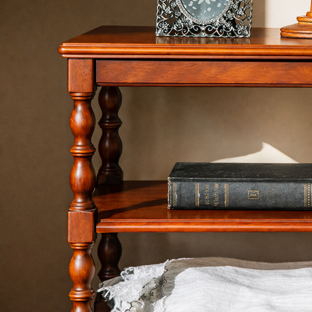 This end table features turned legs for a timeless, traditional look. Two open shelves create easy-access storage for books, décor, or baskets, and the lower drawer is ideal for remotes, coasters, chargers, and other essentials you want tucked away.