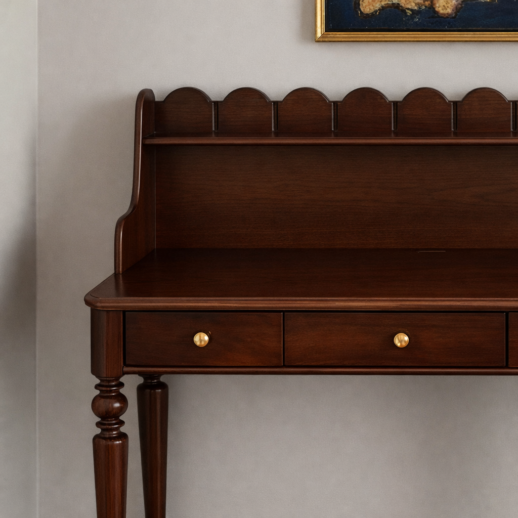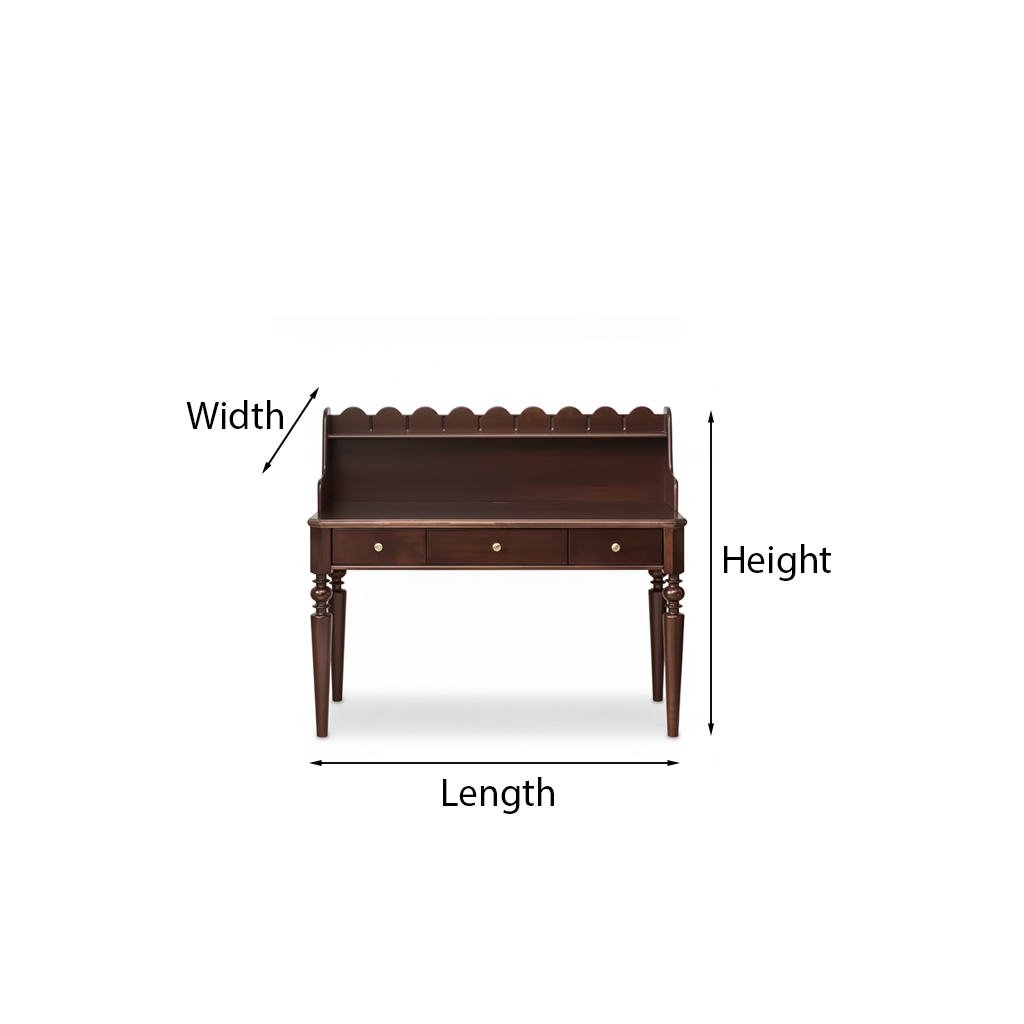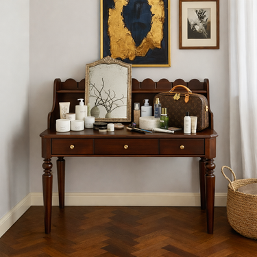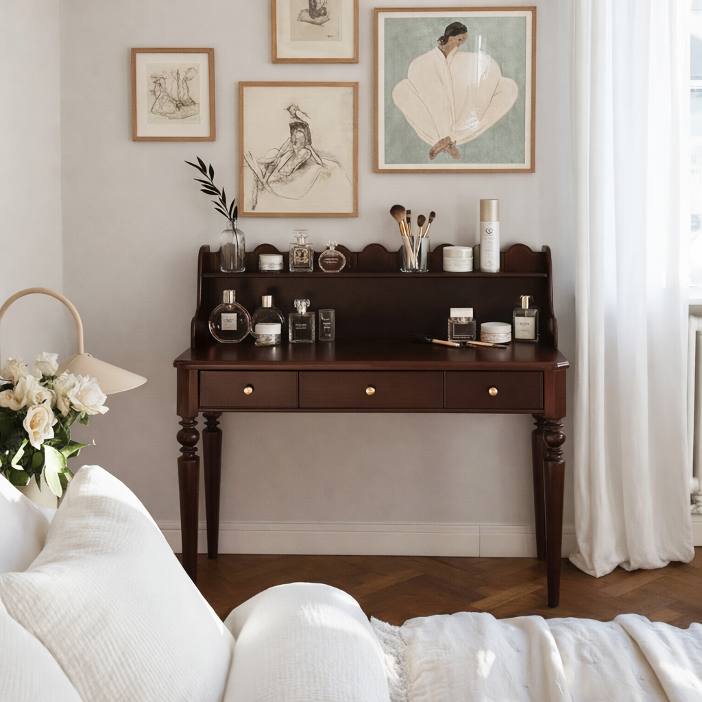 Bring a timeless, organized setup to your daily routine with this Classic Wooden Vanity Desk With Raised Shelf And Three Drawers For Bedroom. The raised back shelf helps keep skincare, perfumes, and décor neatly displayed, while the three drawers store makeup, brushes, and accessories out of sight. Turned legs and clean detailing give it a warm, traditional look that blends easily with classic, vintage, and modern farmhouse interiors.