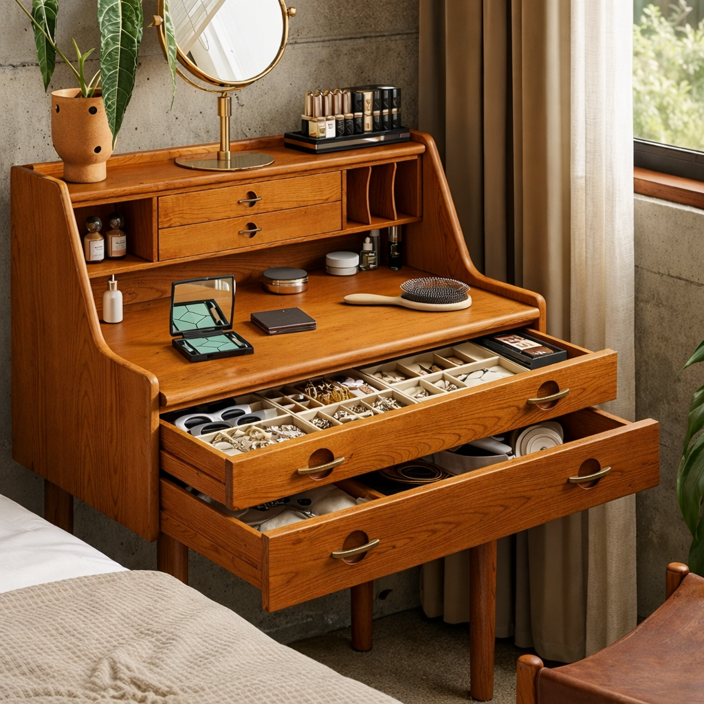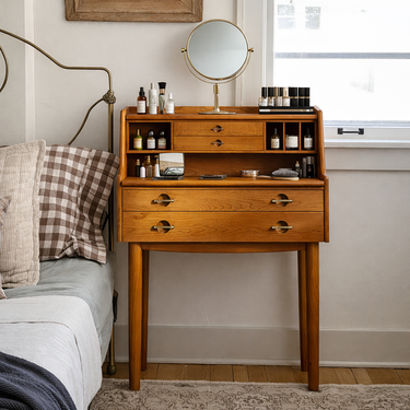 Style it with a small mirror, a tray, and a soft lamp to complete a calm, organized vanity setup.
