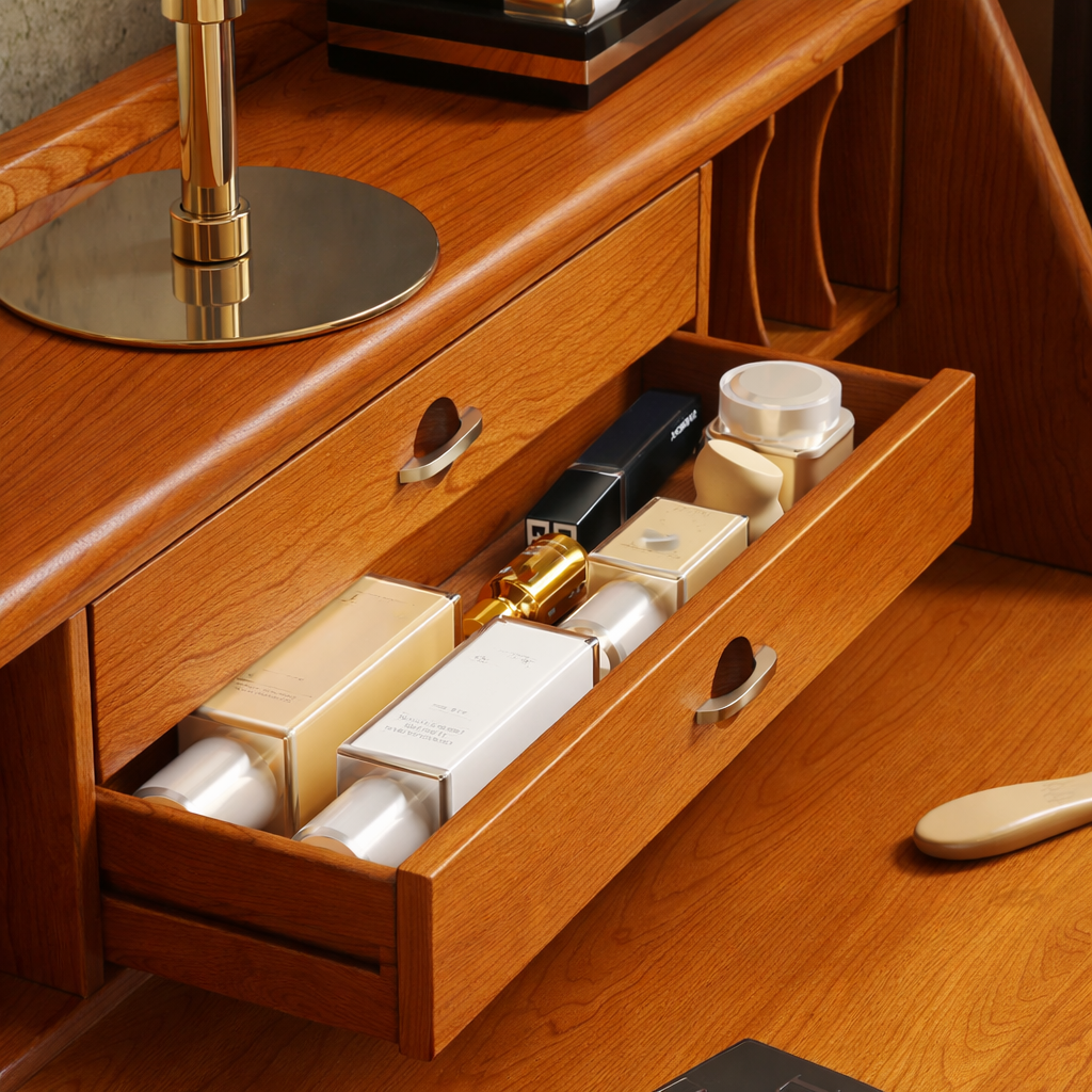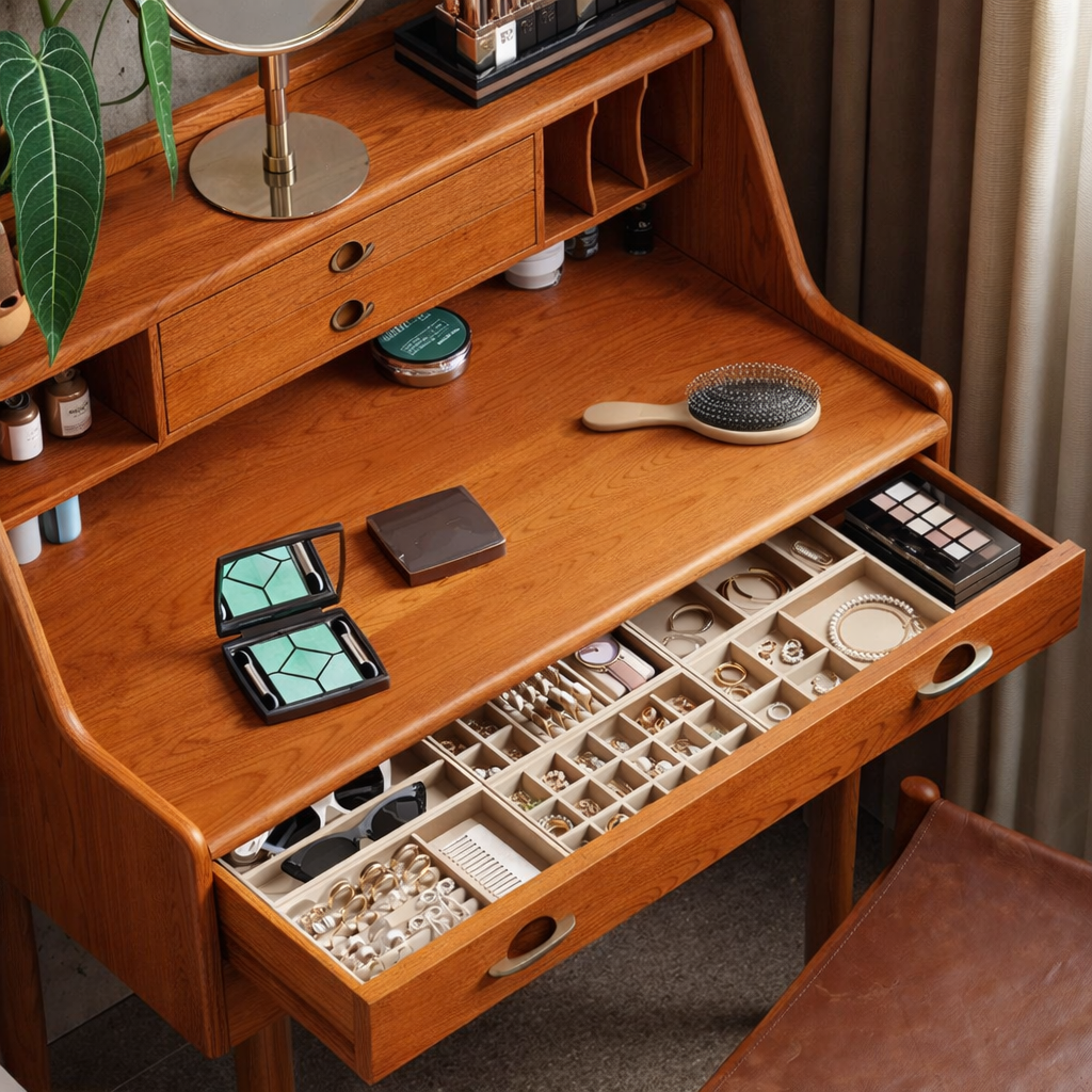Bring a warm, functional getting-ready space into your home with this Traditional Wooden Makeup Vanity Desk With Open Shelves And Storage Drawers For Bedroom. The compact profile, open cubby storage, and smooth wood character create an easy daily setup for skincare, makeup, and small accessories.
