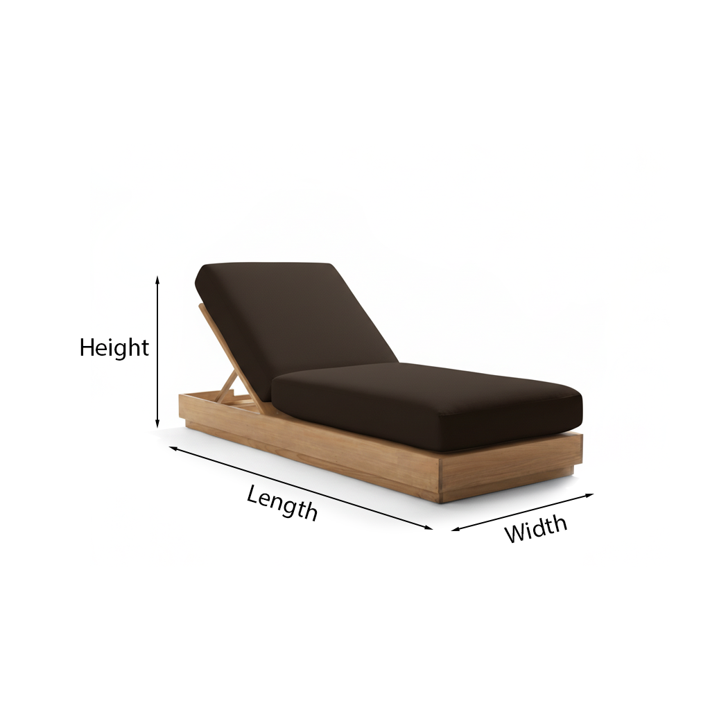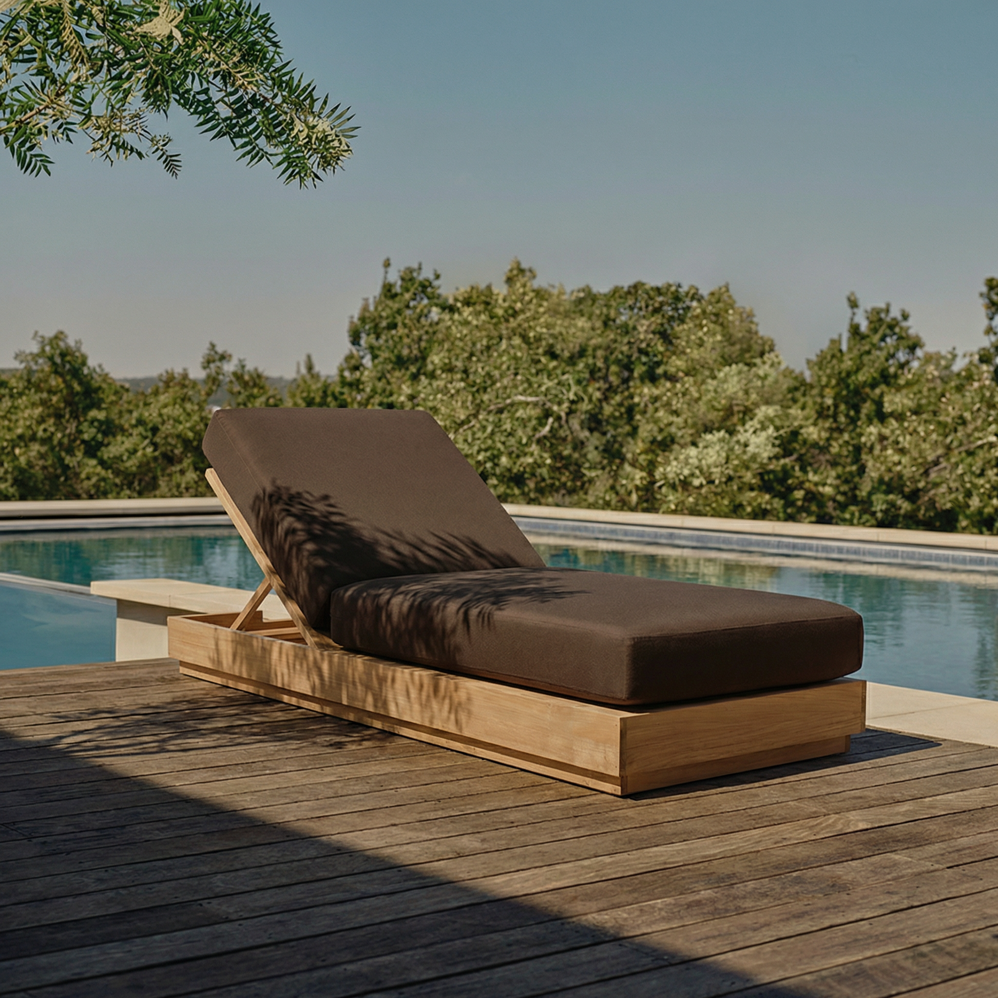 This Modern Poolside Lounge With Cushioned Seat And Wooden Base For Outdoor features a solid wooden base with a streamlined rectangular form that keeps the silhouette grounded and minimal. The adjustable backrest supports comfortable reclining, while the single, seamless cushion surface provides a smooth and cohesive look without visual breaks. The balanced proportions allow the lounge to sit naturally within modern outdoor environments without feeling bulky or decorative.