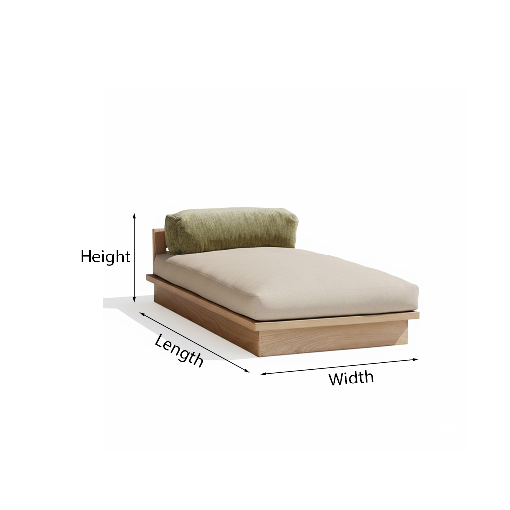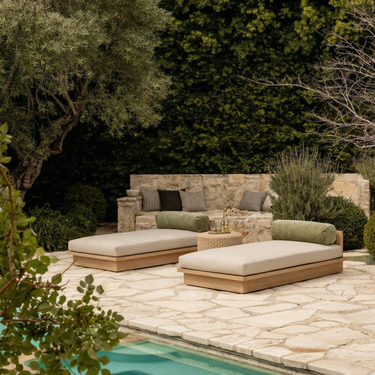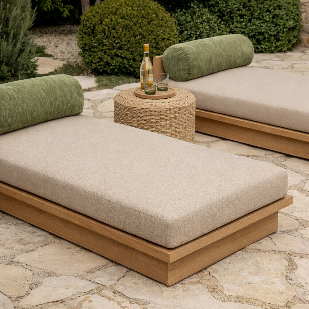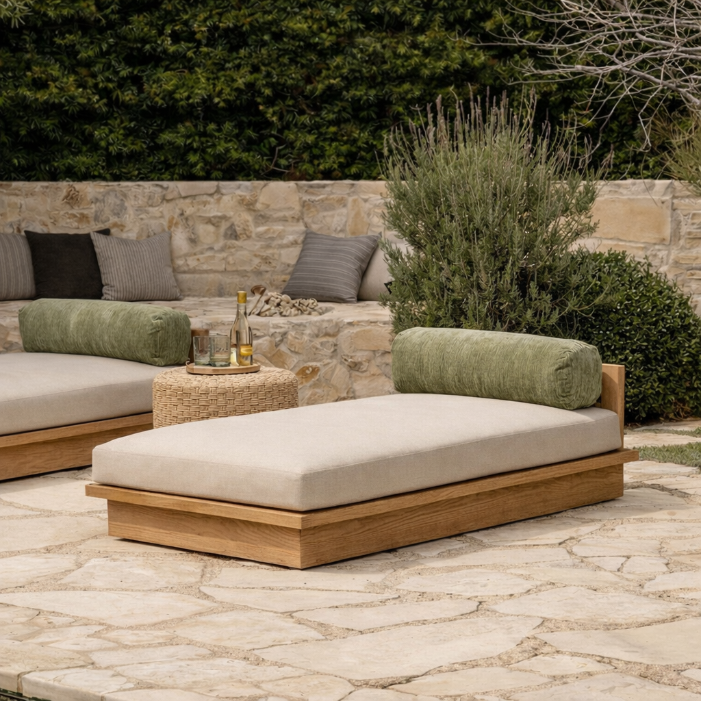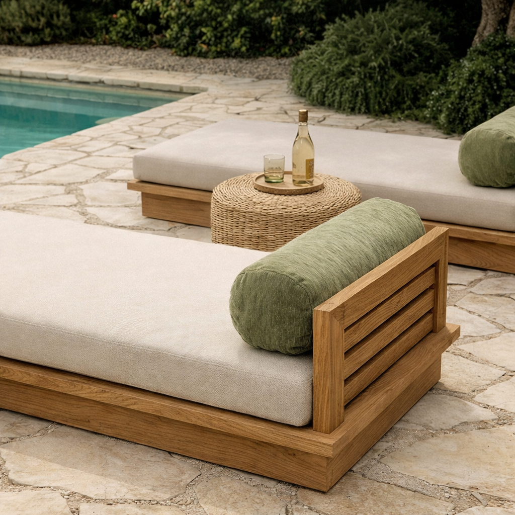 Featuring a sturdy wooden base and soft, supportive cushions, this poolside lounge brings both durability and elegance to your outdoor area. The neutral cushions paired with the natural wood finish create a warm, inviting aesthetic, while the bolster pillows provide extra comfort for long hours of lounging. The minimalist design ensures it complements various outdoor settings.