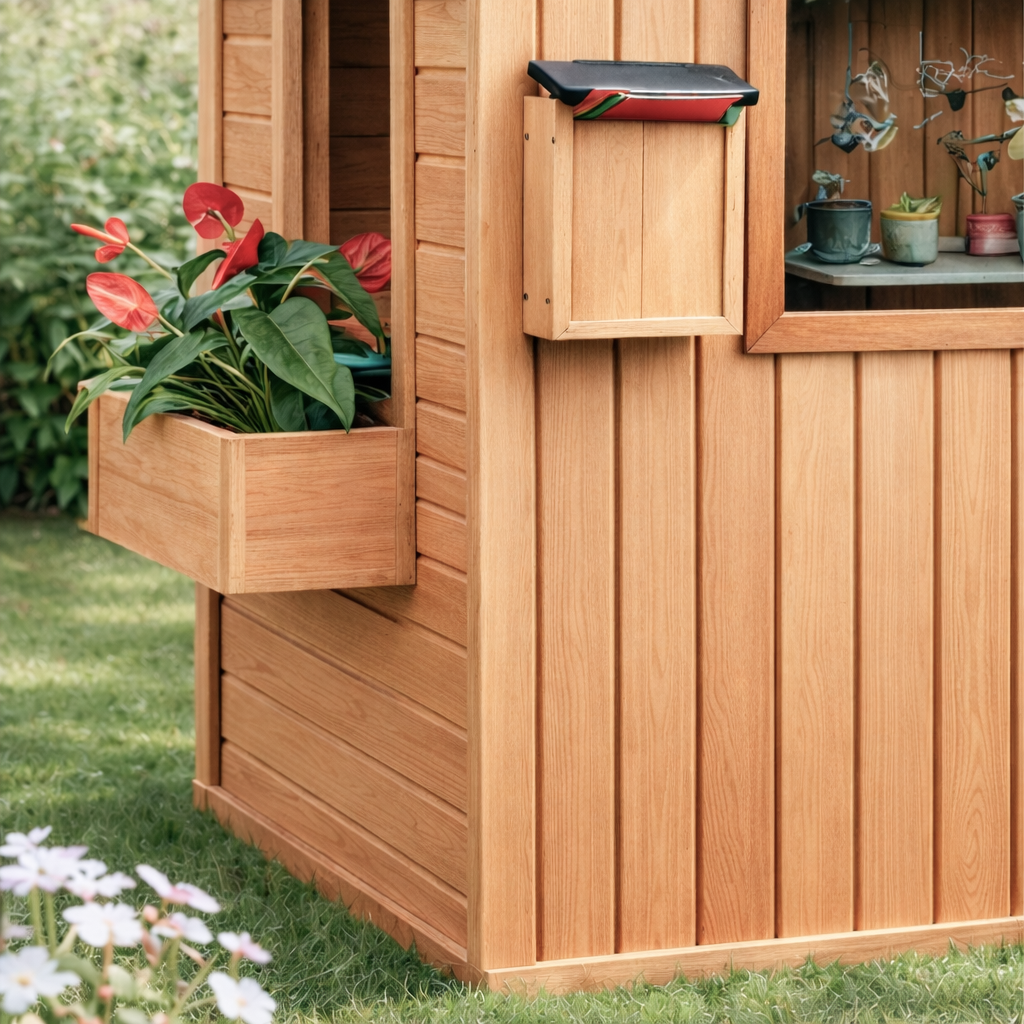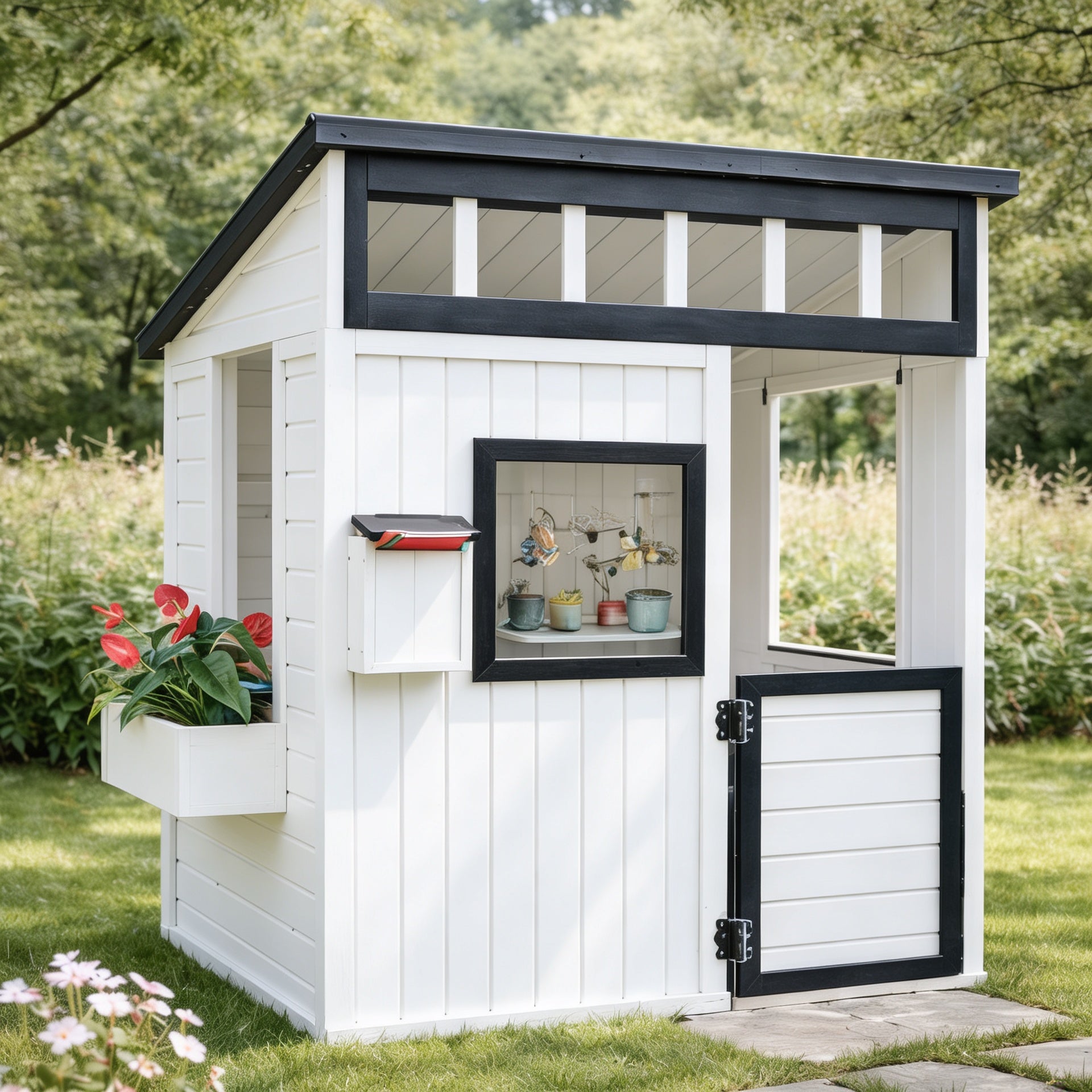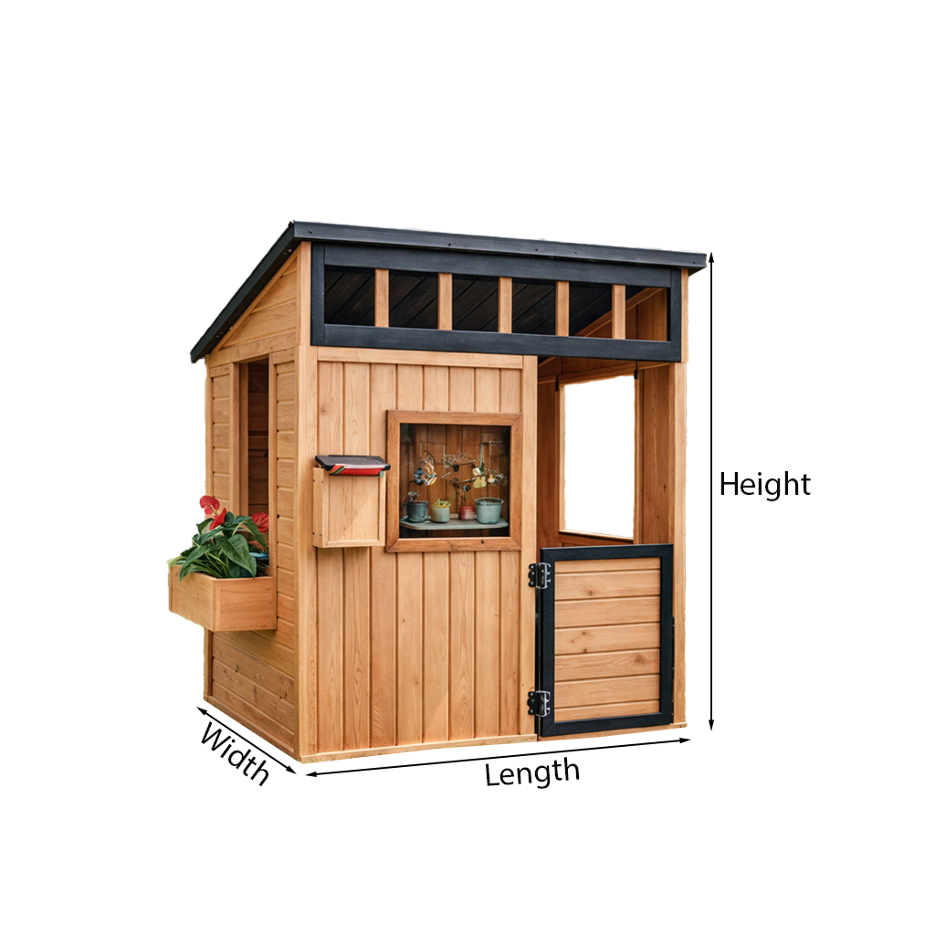 This natural wood kids playhouse features a warm wooden build with a pitched roof and open front section that keeps the space feeling bright and interactive. A serving-style window adds a playful “shop” or “café” feel, making it easy for kids to role-play, share toys, or set up pretend snacks. The half door detail helps define the entry while keeping the play area open and easy to access. Clean paneling and contrast trim give the playhouse a structured, modern cottage look that blends naturally into garden settings.