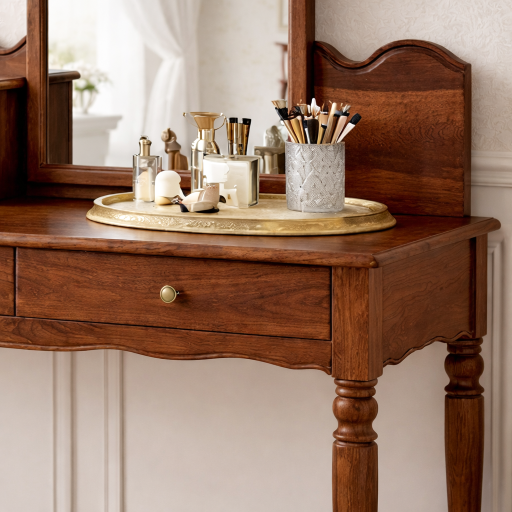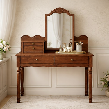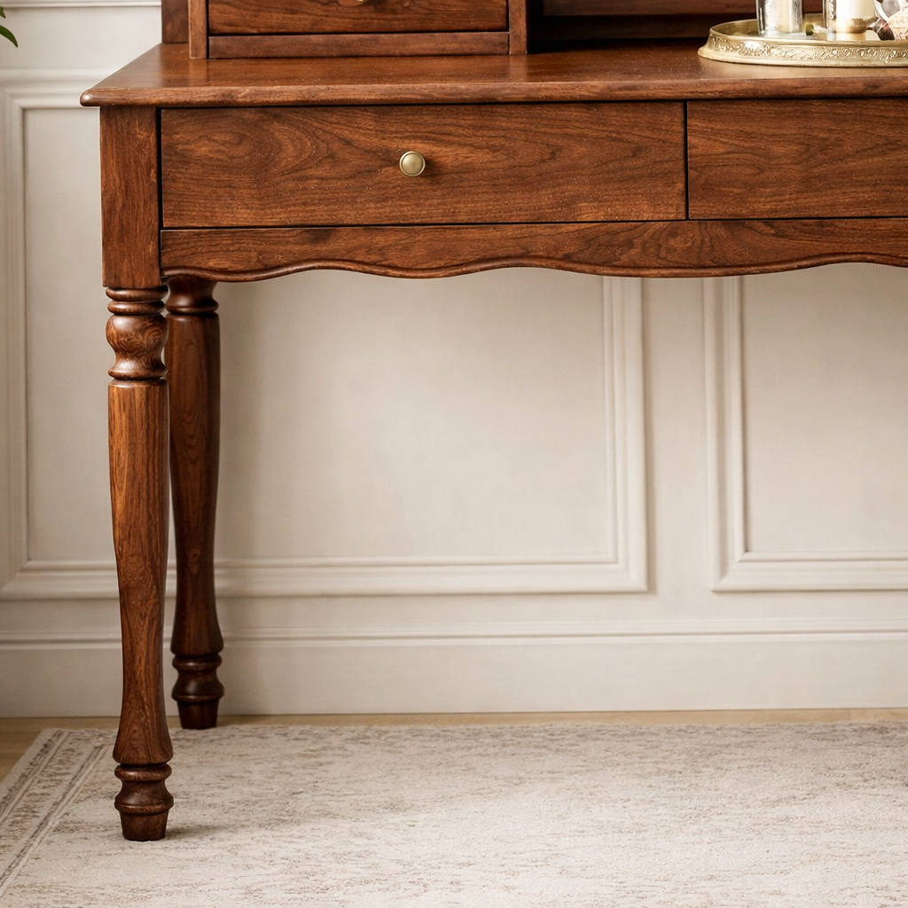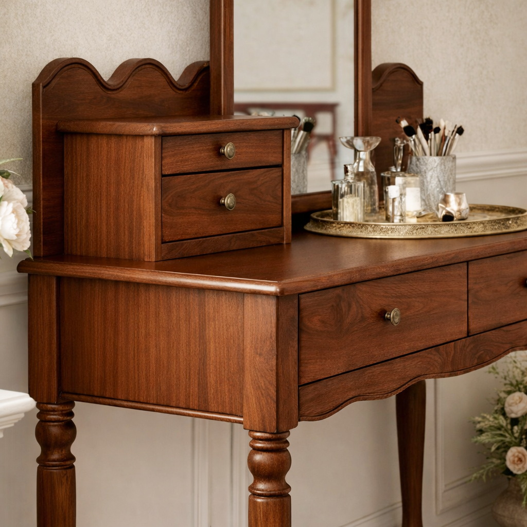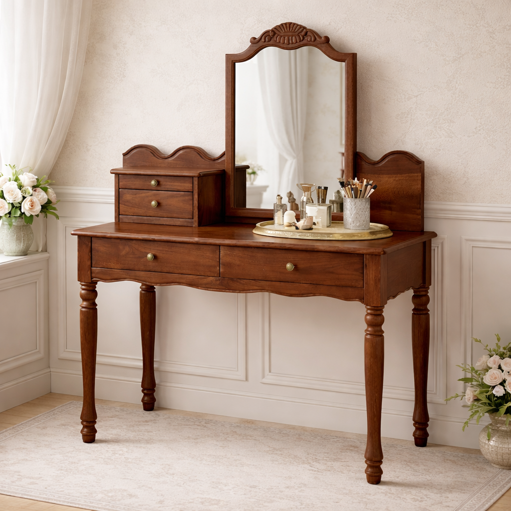 Integrated drawers create practical storage for makeup, brushes, and small essentials, helping maintain a tidy and composed surface. Turned legs and softly shaped edges enhance the traditional aesthetic, giving the piece an elegant presence without overwhelming the room.