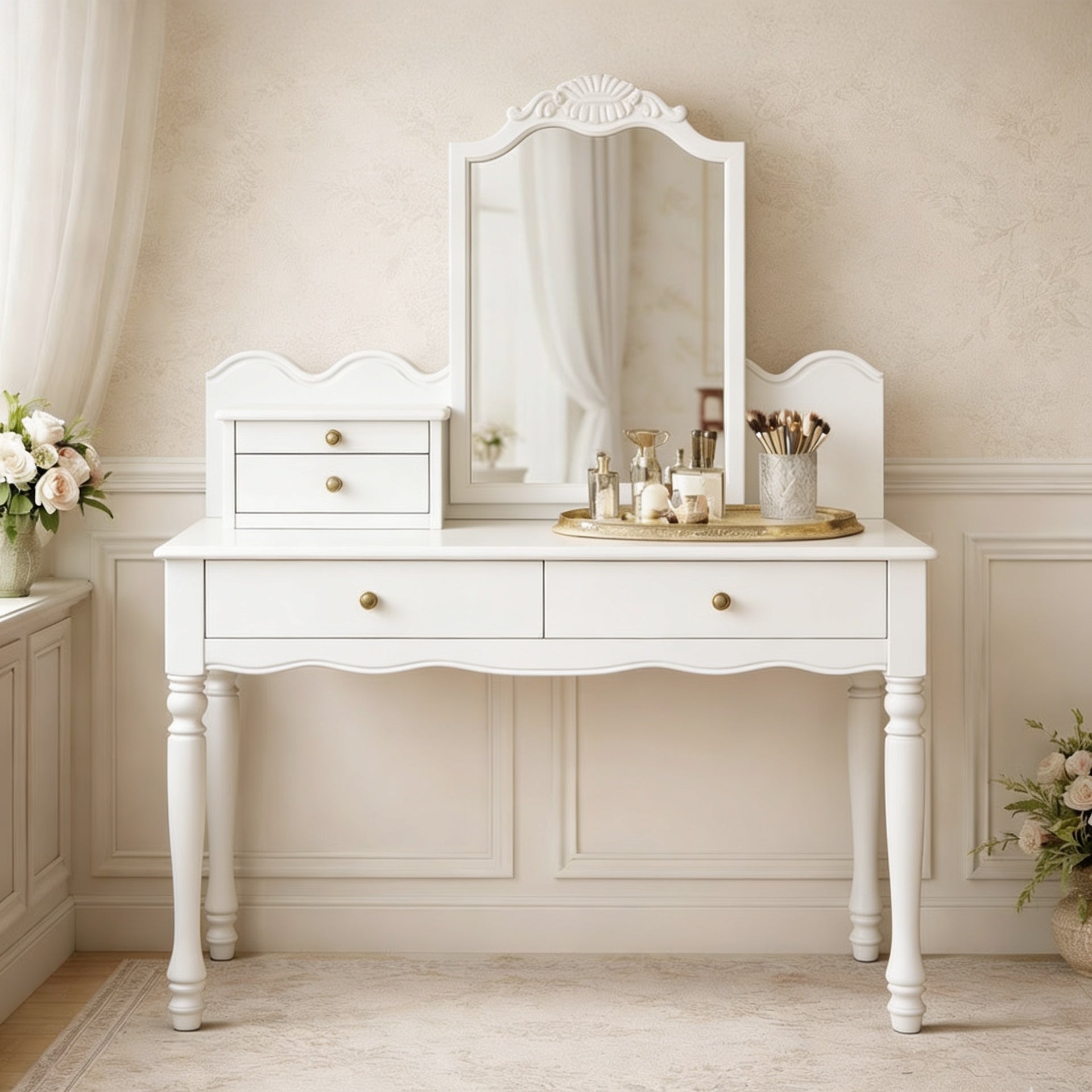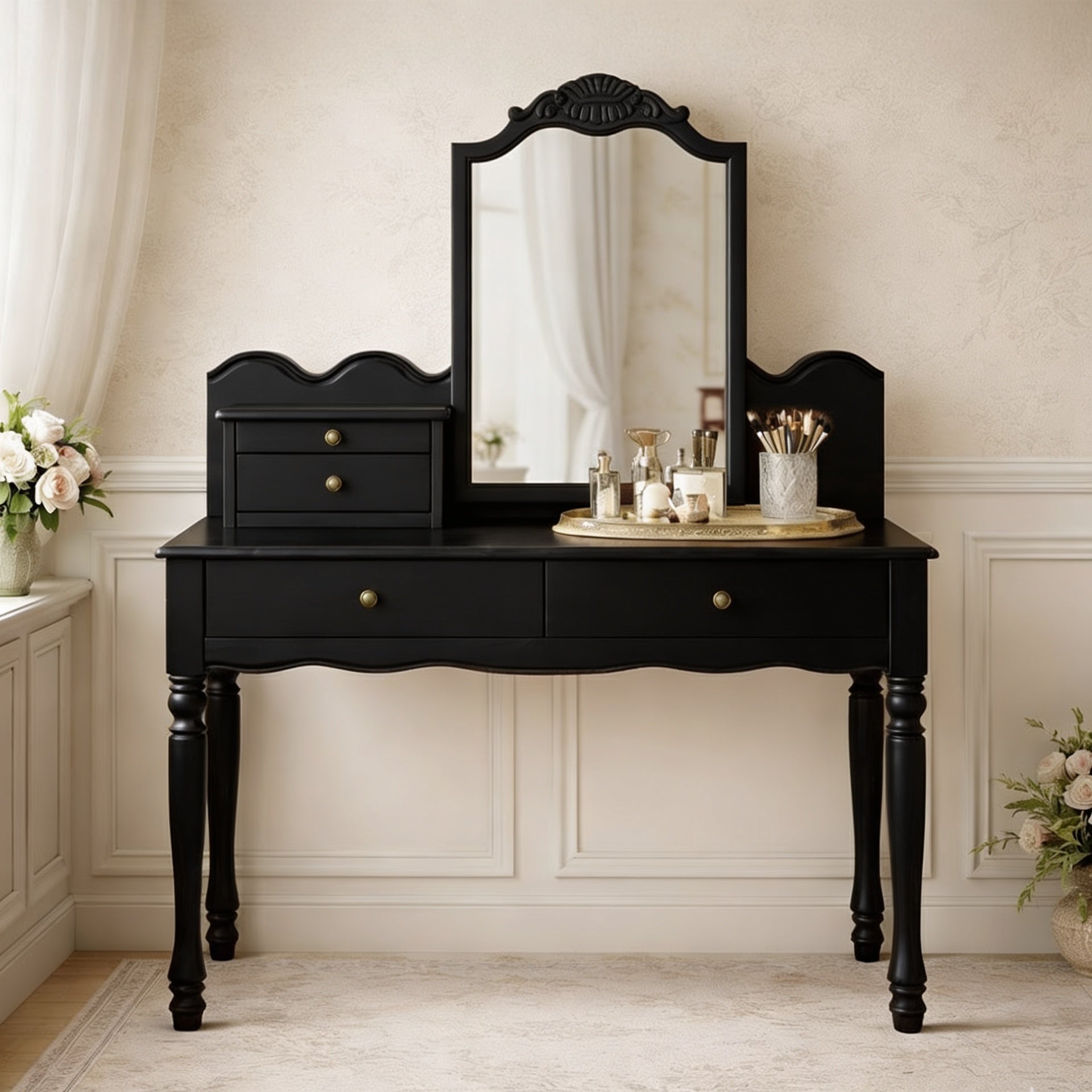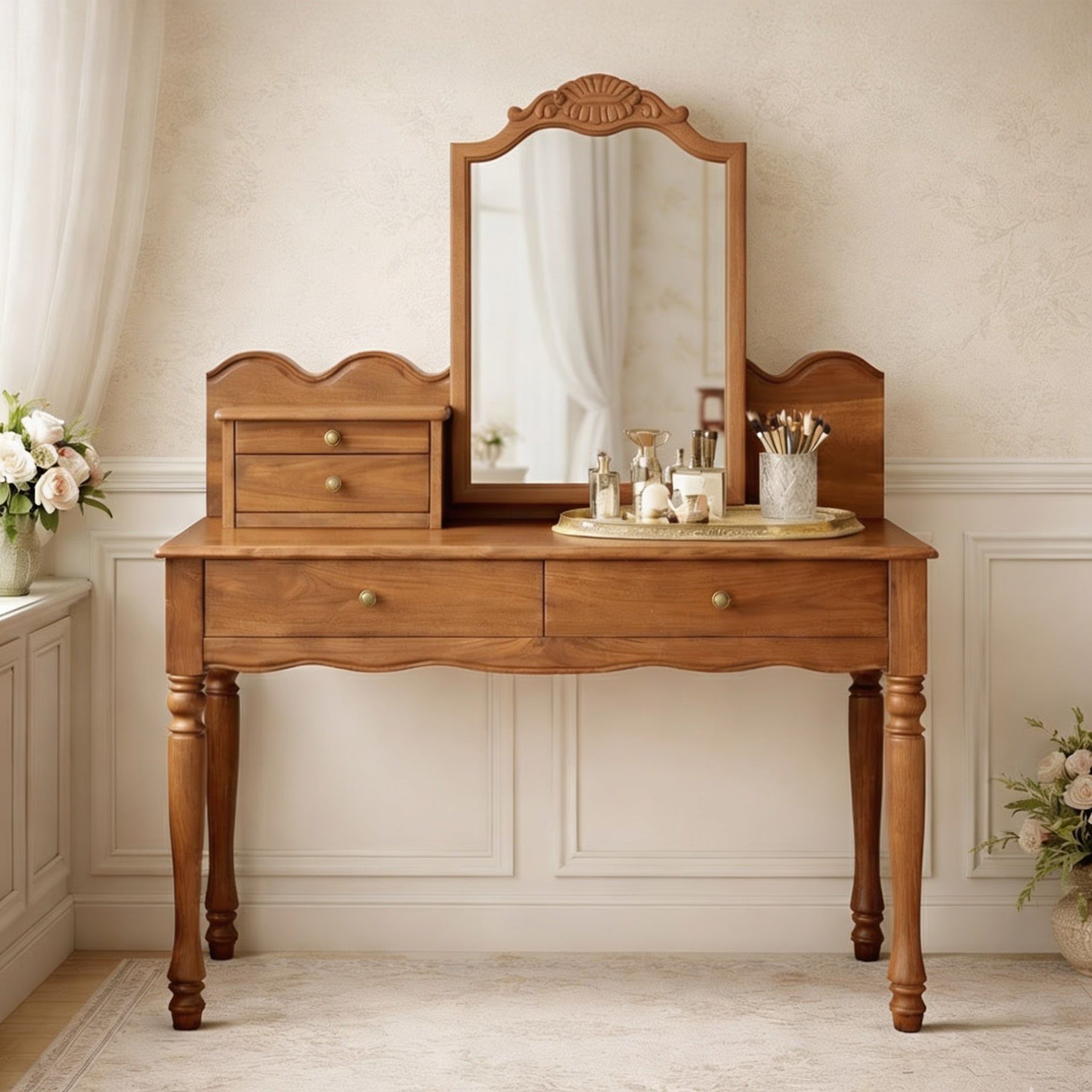Integrated drawers create practical storage for makeup, brushes, and small essentials, helping maintain a tidy and composed surface. Turned legs and softly shaped edges enhance the traditional aesthetic, giving the piece an elegant presence without overwhelming the room.