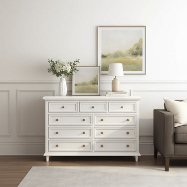 Elevate your bedroom with the timeless charm and refined presence of this classic wooden dresser for the bedroom, featuring beautifully framed drawer fronts, soft curves, and warm gold accents. Designed for interiors that appreciate understated elegance, this piece adds brightness and graceful structure to any room.