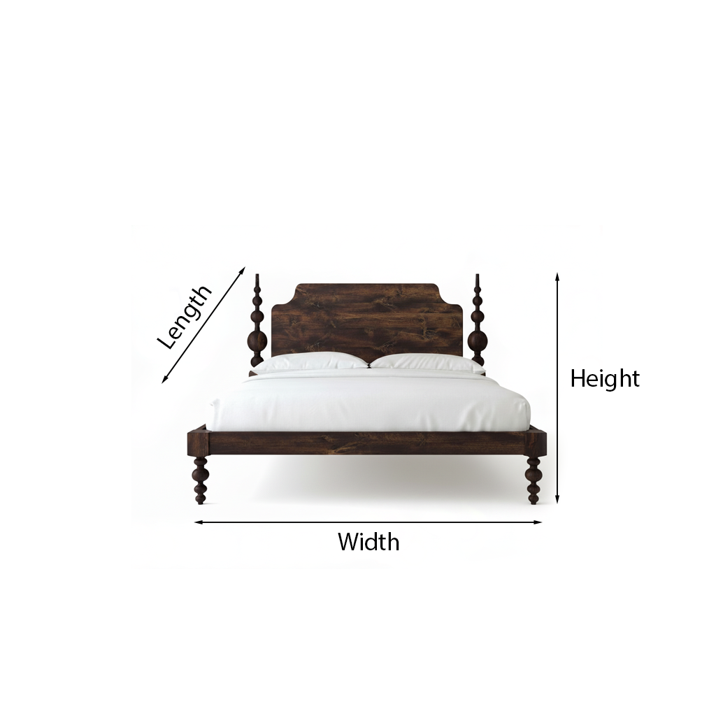 This bed frame features a smooth wooden headboard with a soft curved profile, paired with turned post details that add timeless character. The low, clean frame keeps the silhouette balanced, while the raised base offers a light, open feel around the bed. Its farmhouse styling pairs beautifully with layered bedding, neutral palettes, and simple décor.
