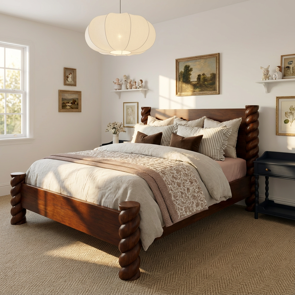 This bed frame features bold twist posts at the headboard and footboard, paired with a smooth wooden panel that highlights the natural wood look. The sturdy frame feels grounded and supportive, while the open under-bed area helps the room stay visually light. With its classic farmhouse silhouette, it pairs beautifully with layered bedding, soft neutrals, and vintage-inspired accents.