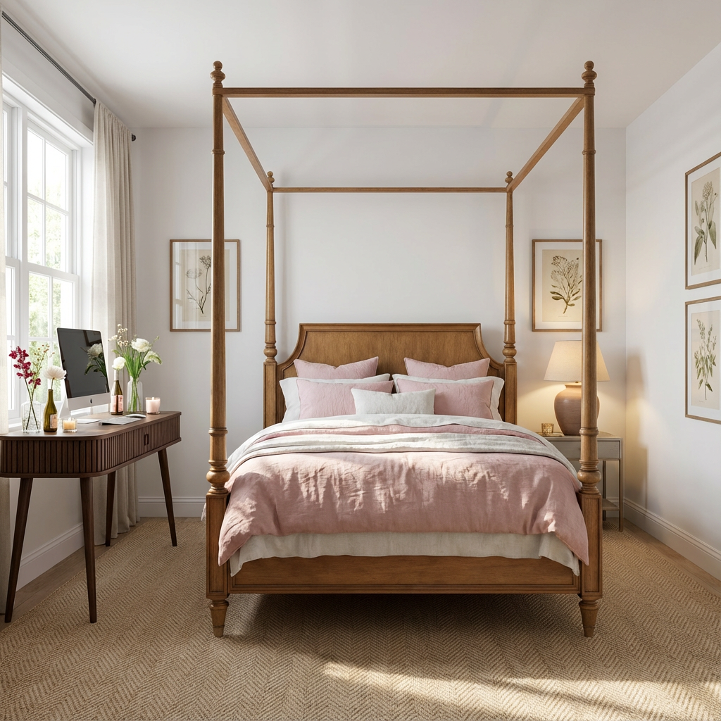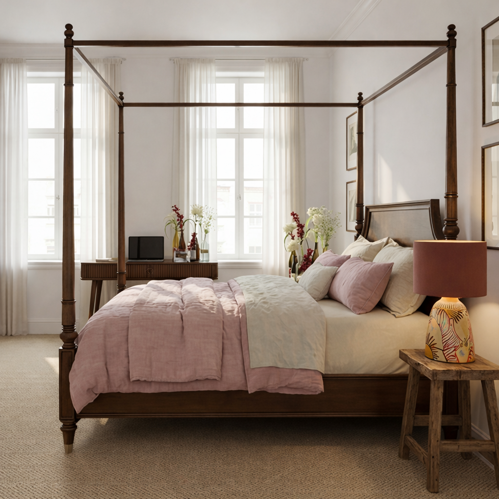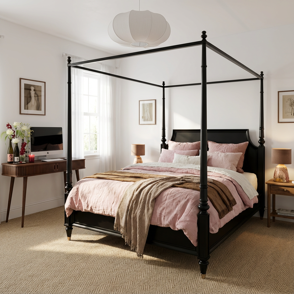 Create a warm, statement centerpiece with this Farmhouse Wooden Canopy Bed Frame For Bedroom. Designed with a tall canopy structure and classic proportions, it adds height, balance, and a cozy farmhouse feel—ideal for a calm, styled bedroom.