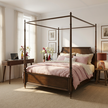 This bed frame features a sturdy wooden canopy with turned posts and clean overhead rails that define the silhouette without feeling heavy. A shaped headboard and matching footboard complete the farmhouse-inspired profile, pairing naturally with layered bedding and soft lighting. The open canopy design also makes it easy to style with your own curtains, drapes, or leave it clean and minimal.