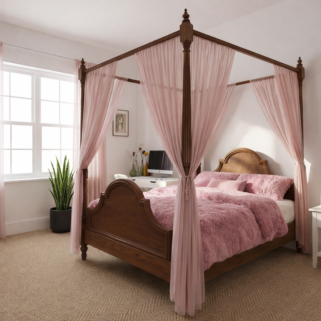 Bring a soft, classic focal point to your space with this Farmhouse Wooden Canopy Single Bed Frame For Bedroom. Designed for one person, the tall canopy structure and traditional profile add height and warmth while keeping the room feeling open and balanced.