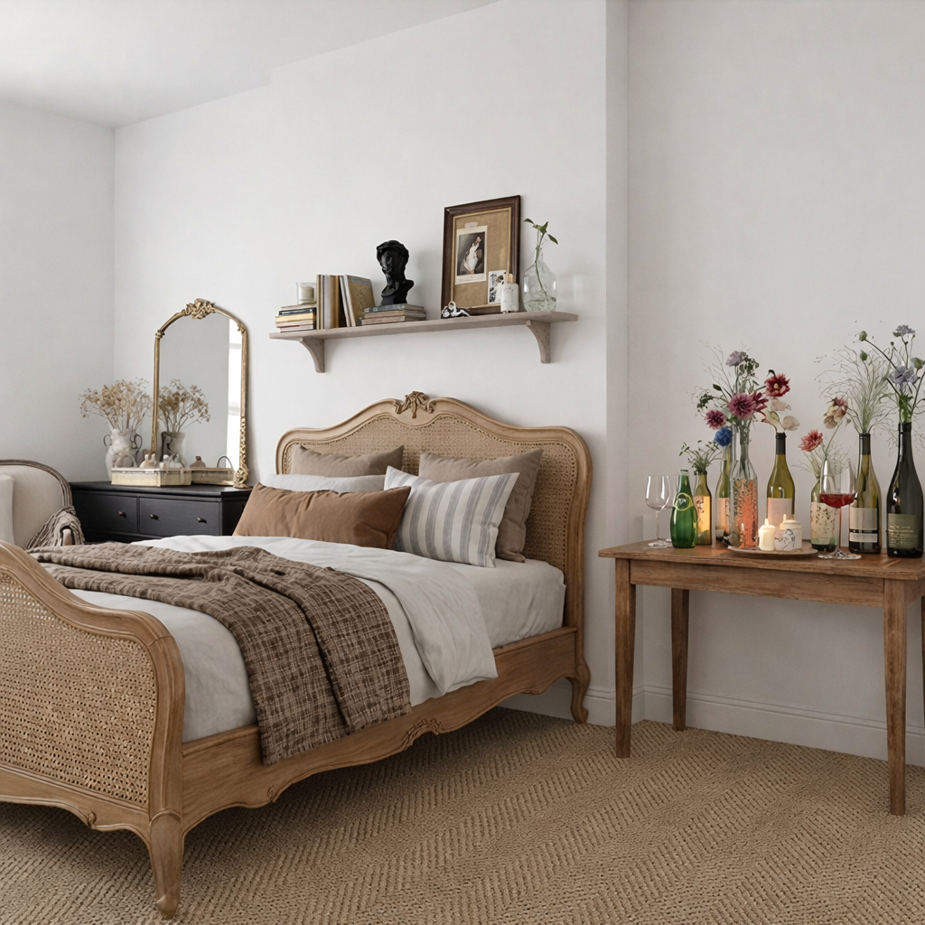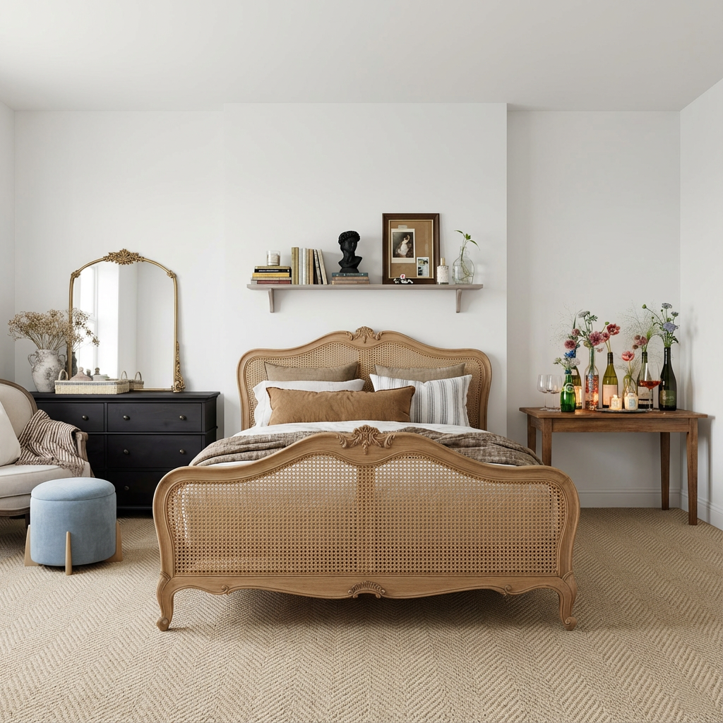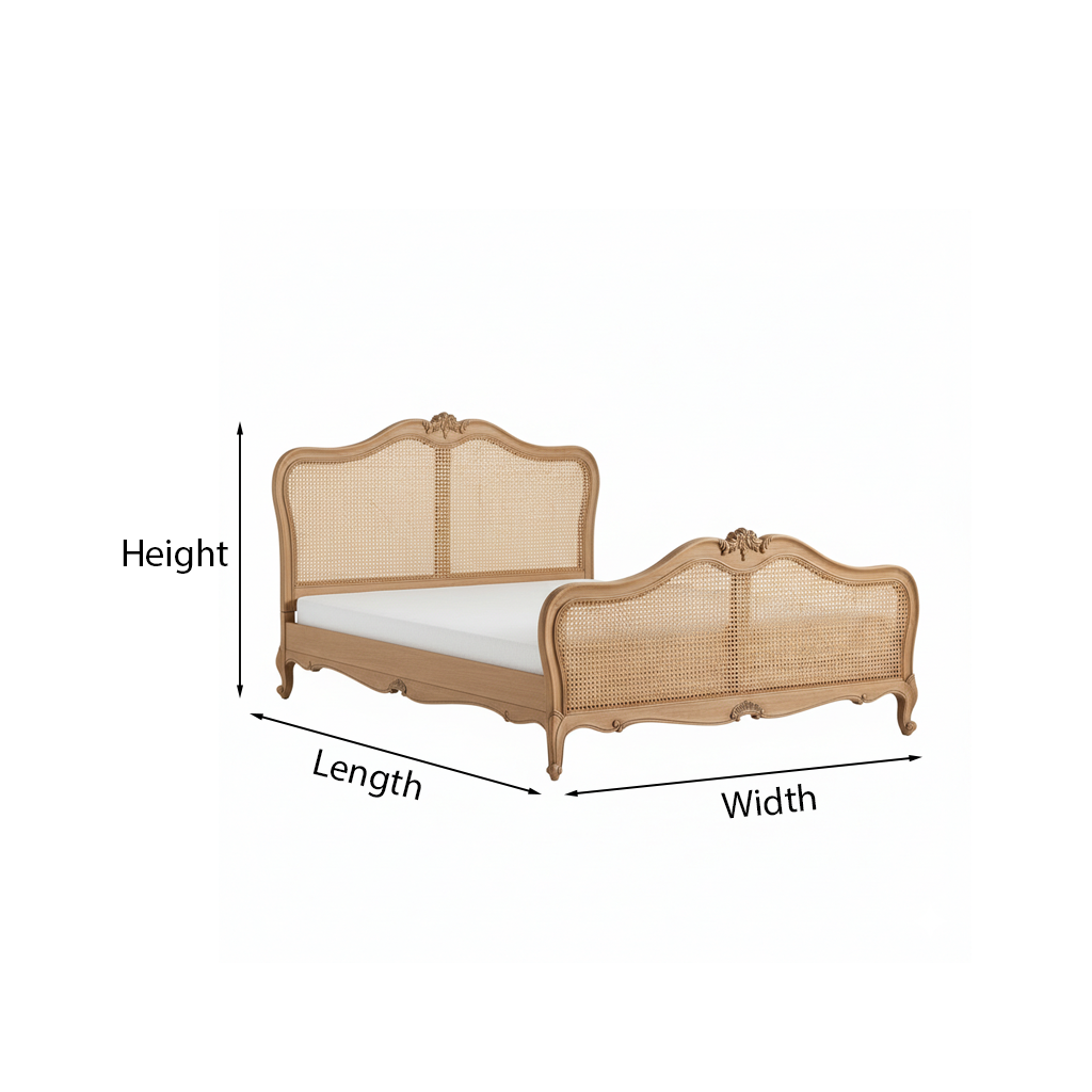 This bed frame features a curved wooden headboard and footboard with woven rattan cane panels that create depth and visual softness. The carved accents and flowing lines give it a French country character, while the open cane weave keeps the overall profile feeling bright and balanced. A sturdy wooden base supports your mattress and creates a clean, grounded finish for everyday use.