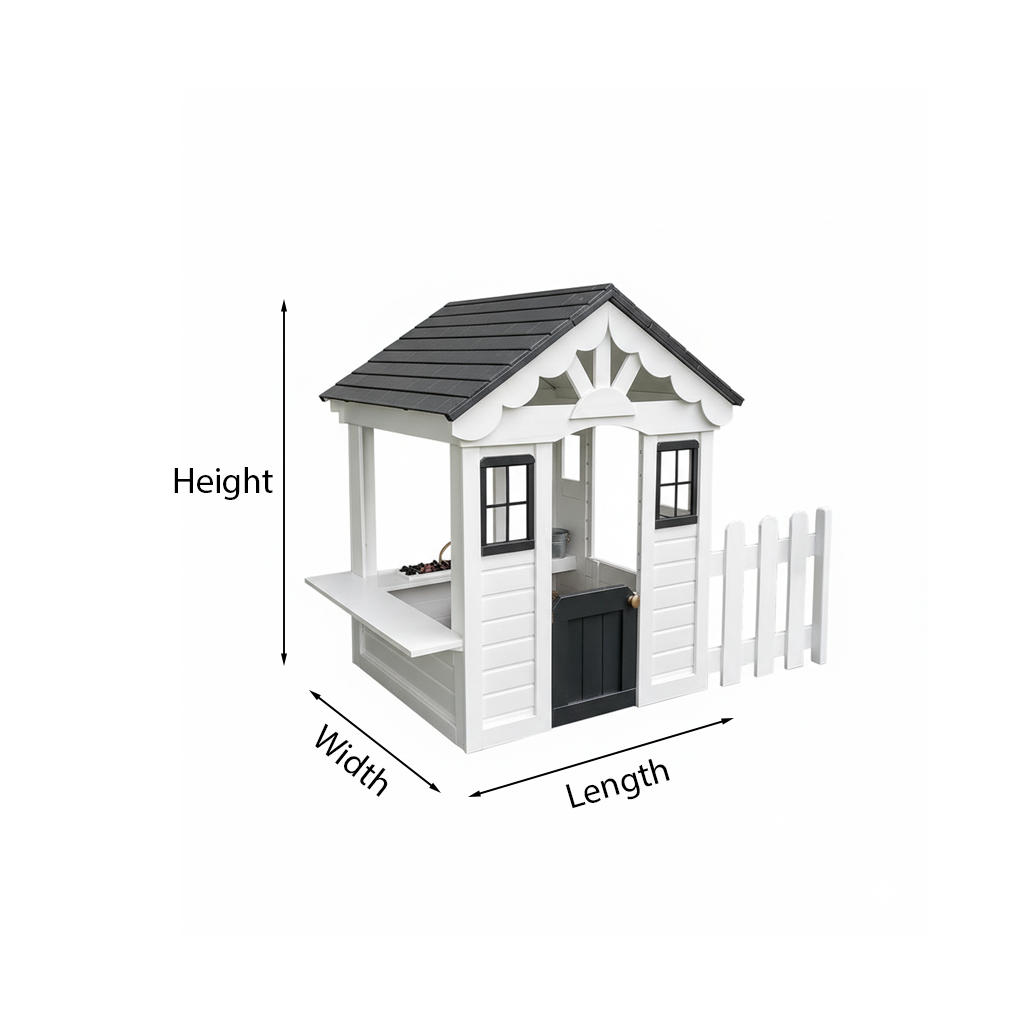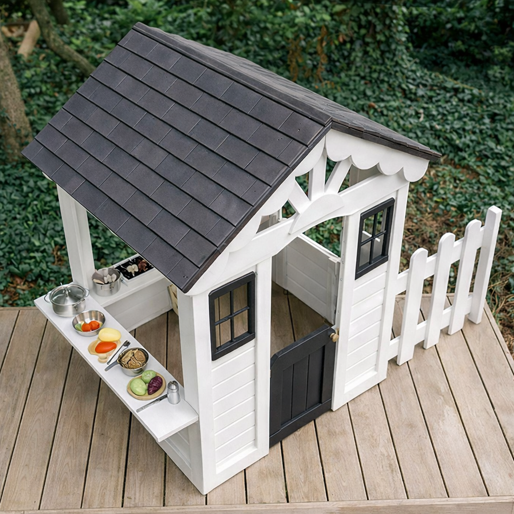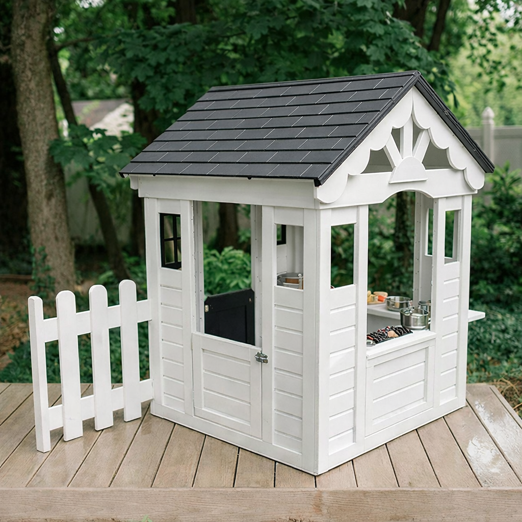 This playhouse features a sturdy natural wood structure with a sloped roof, crafted windows, and a white fence detail that enhances the look of a mini house. The black roof adds a sleek contrast while the white exterior panels create a fresh, inviting appearance suited for backyard settings.