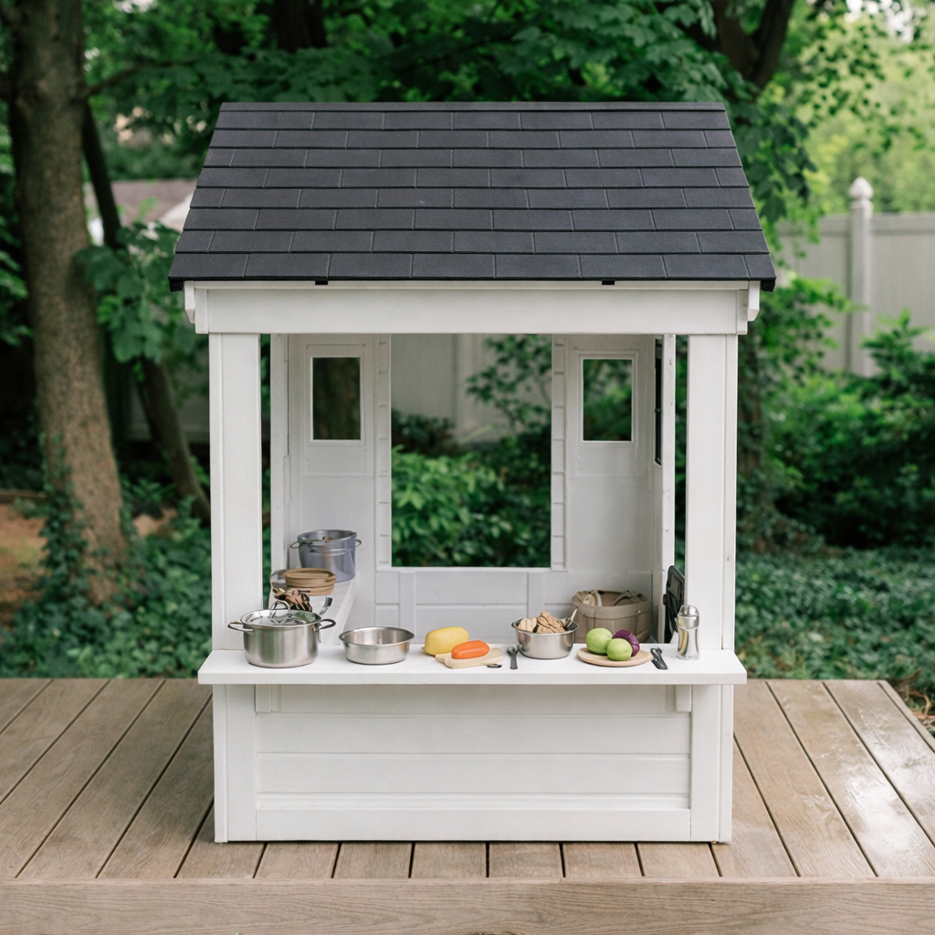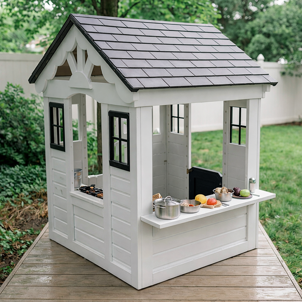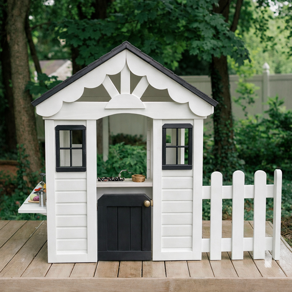 This playhouse features a sturdy natural wood structure with a sloped roof, crafted windows, and a white fence detail that enhances the look of a mini house. The black roof adds a sleek contrast while the white exterior panels create a fresh, inviting appearance suited for backyard settings.