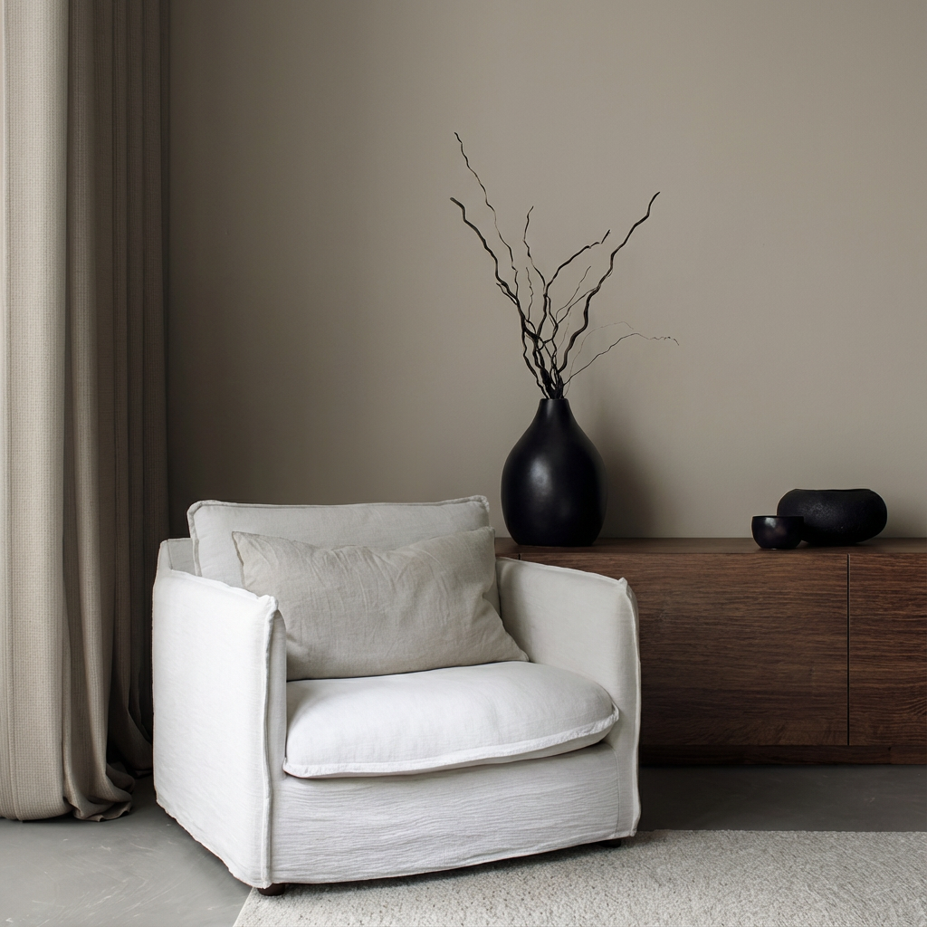 This lounge chair features a linen slipcovered exterior with a smooth, tailored shape and gently structured arms. The deep seat cushion creates an inviting place to sit, while the loose back cushion offers flexible support for reading, lounging, or slow mornings by the window. Subtle fabric texture and natural drape give the chair a warm, lived-in feel without looking heavy.