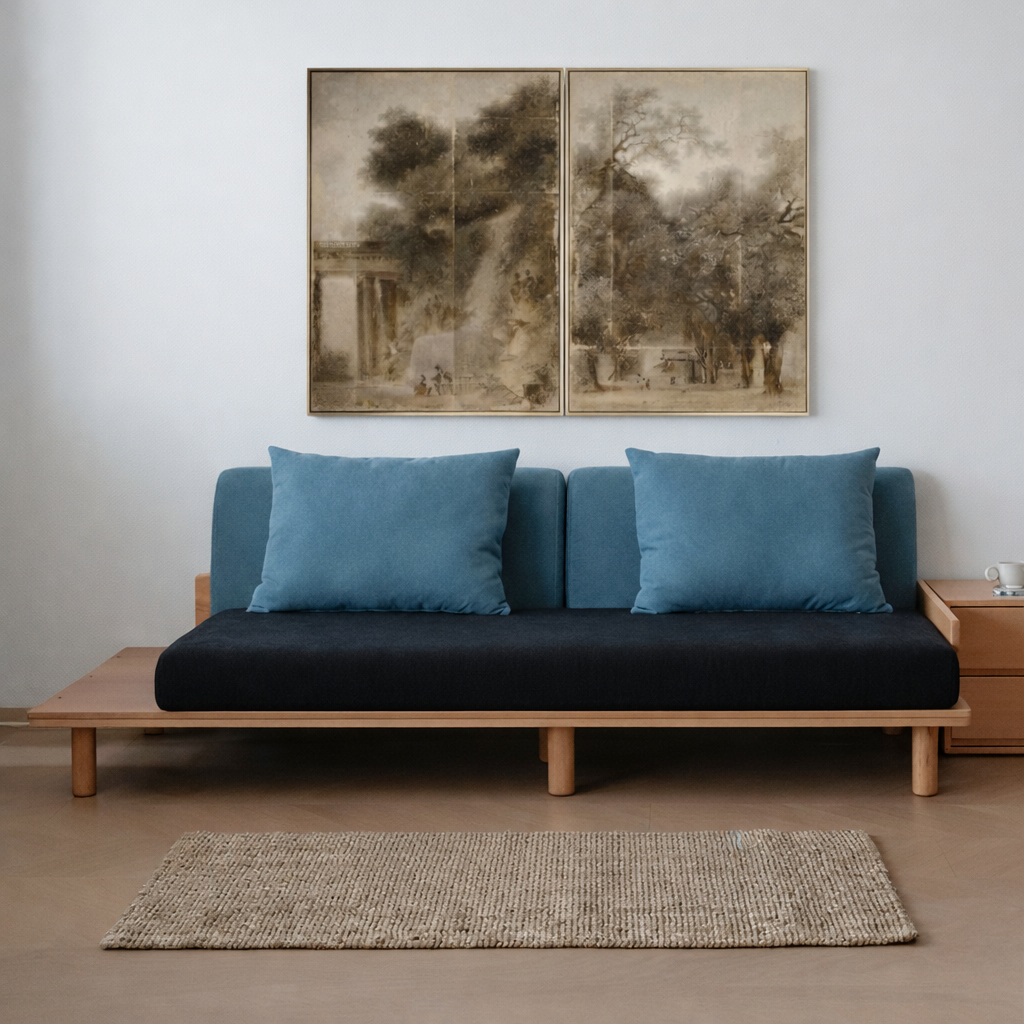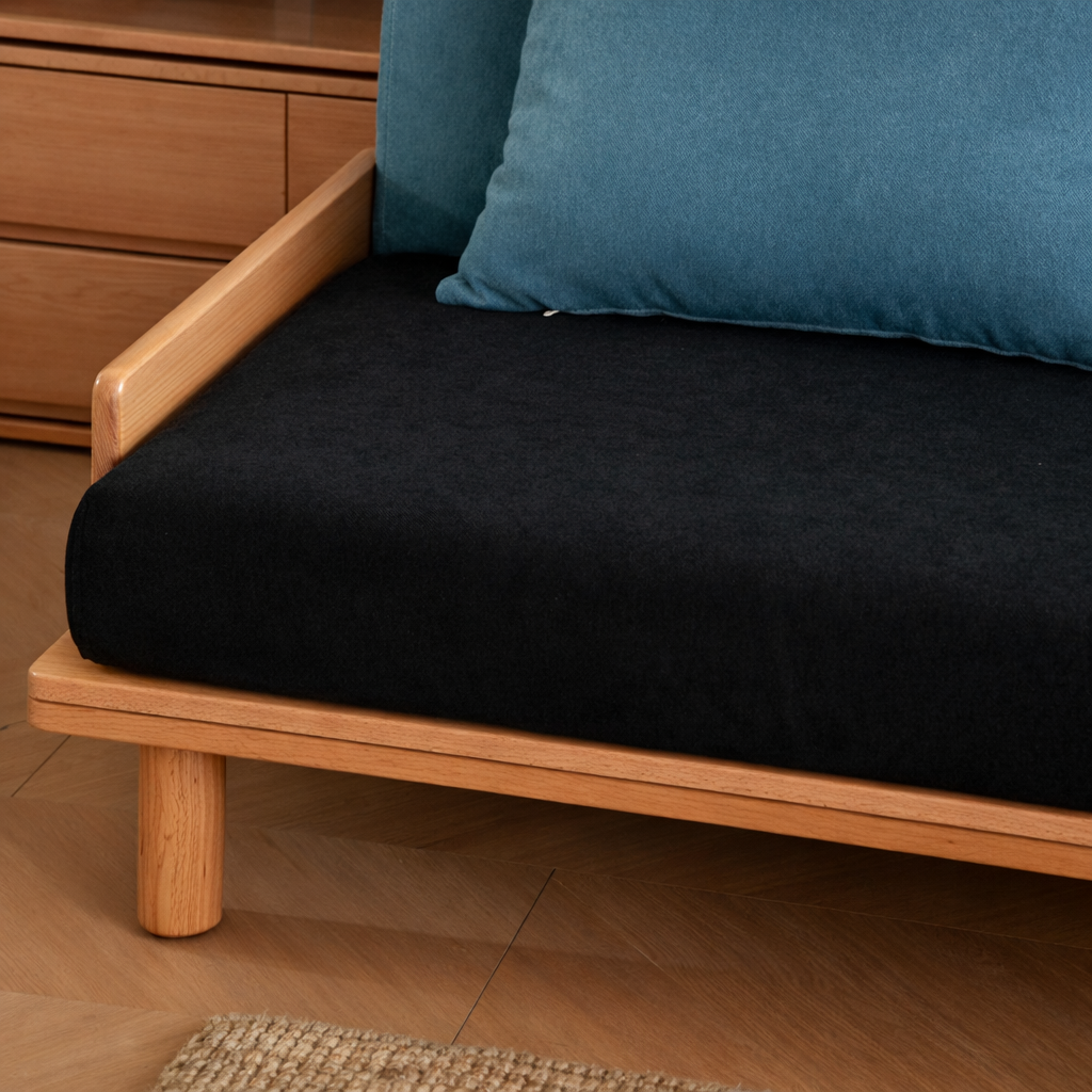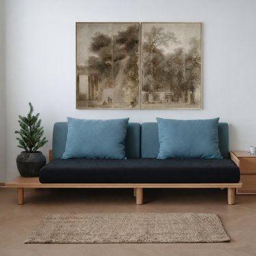 Upholstered seat and back cushions paired with a wooden platform frame. Surface tone and fabric texture may appear slightly different depending on lighting and screen settings.