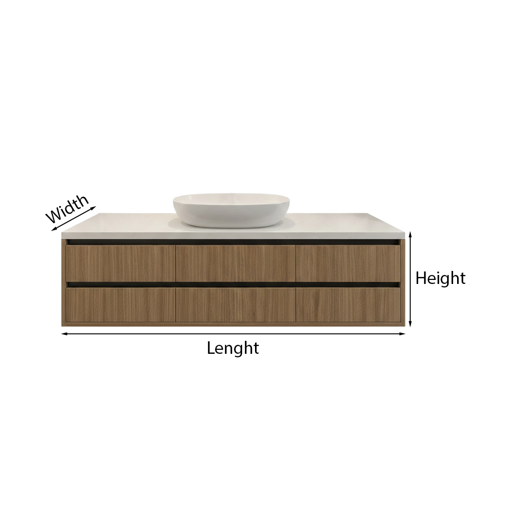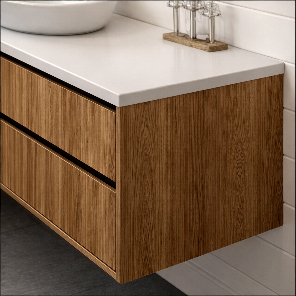 The stone look top provides a smooth upper surface with a stone-like appearance, suitable for everyday use. The floating installation keeps the floor visible, making the space easier to clean and maintain.