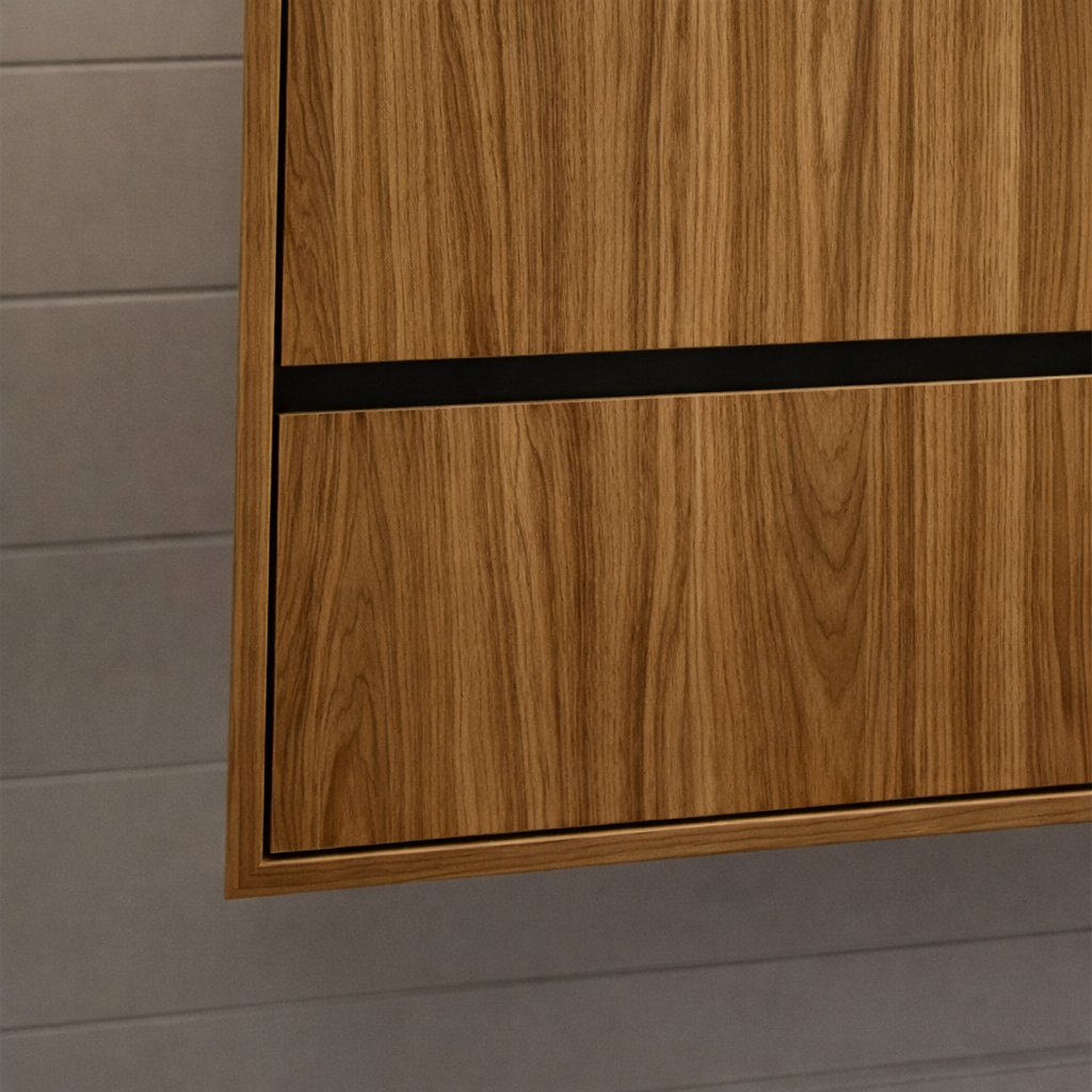 Add clean, wall-mounted storage with a simple, modern layout using this Modern Natural Wood Bathroom Vanity With Handleless Drawers For Bathroom. Designed to keep daily essentials organized while keeping the floor area clear, it combines handleless drawers with a stone look top for a practical and easy-to-maintain bathroom surface.