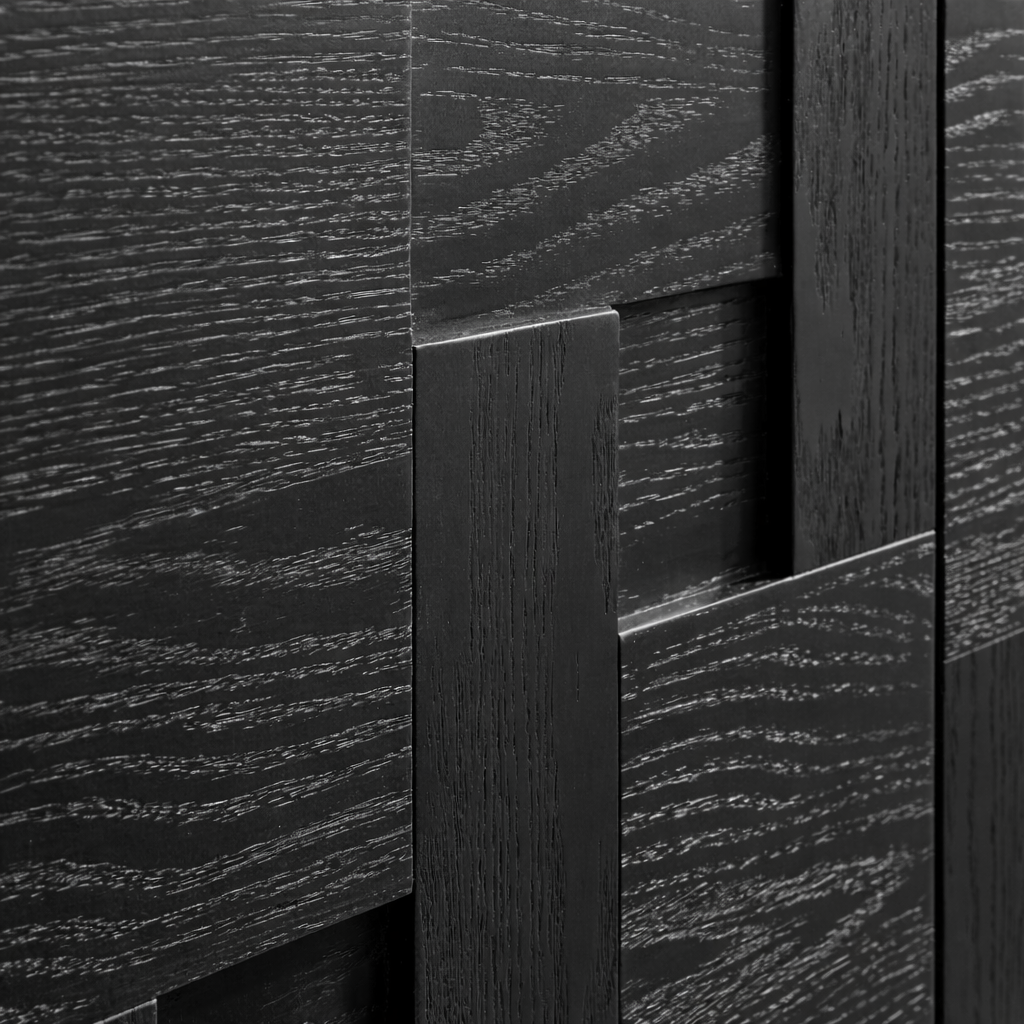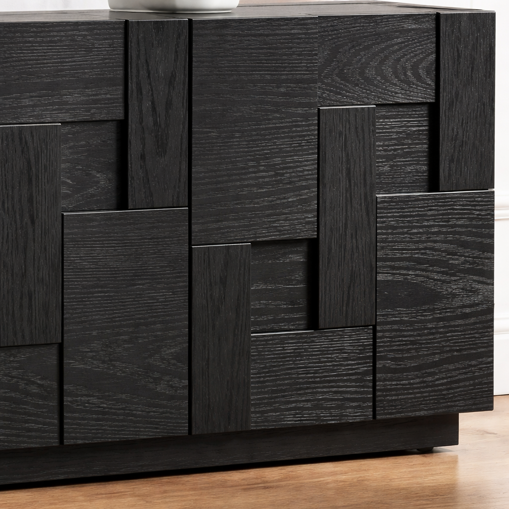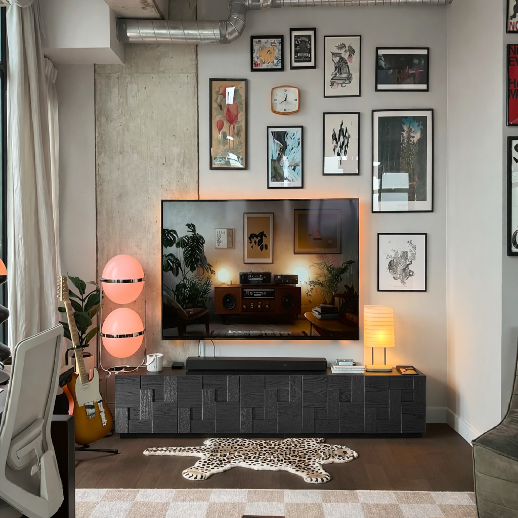 The front is defined by geometric panel doors that add layered texture and a sculptural look without feeling overly decorative. This detailed surface gives the stand a more architectural feel, while the concealed storage helps keep media accessories, cables, and other essentials neatly out of sight. The clean top surface also leaves room for a soundbar, books, or a few decorative accents.