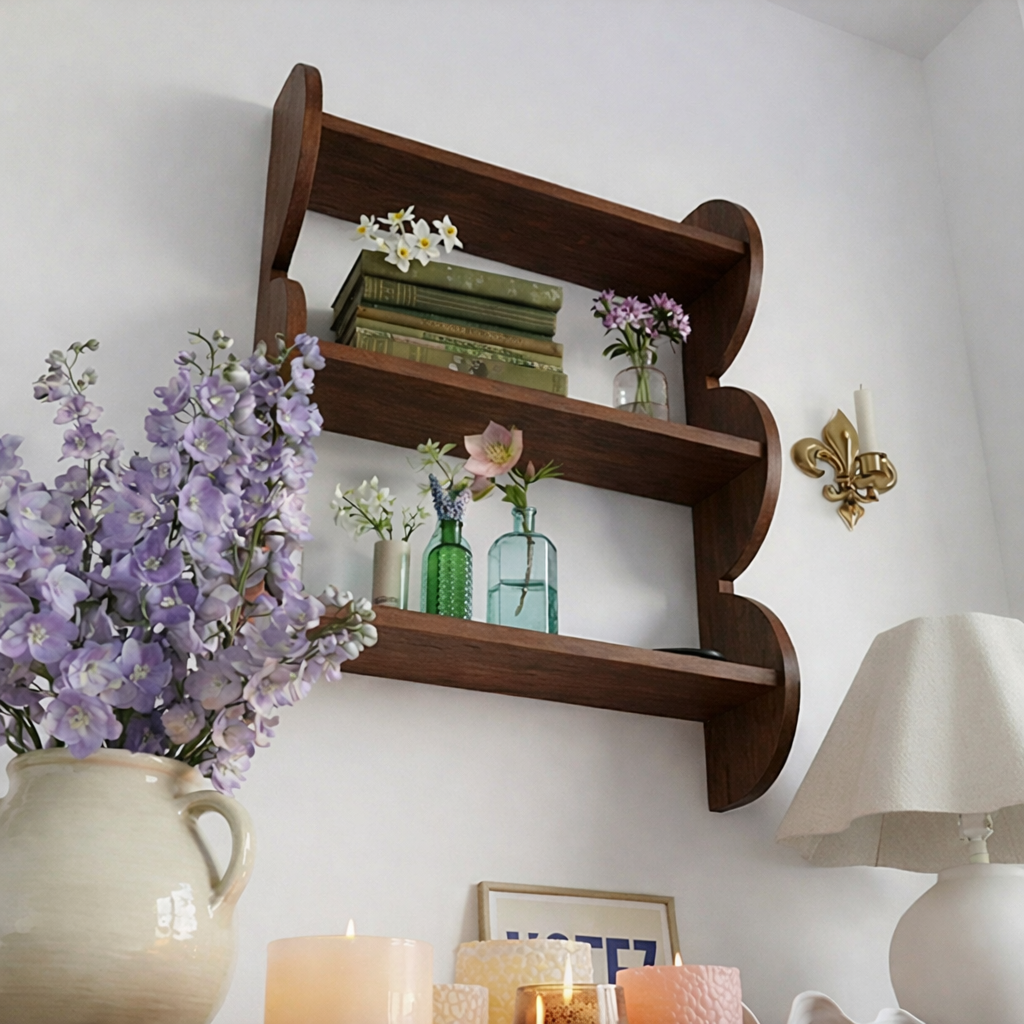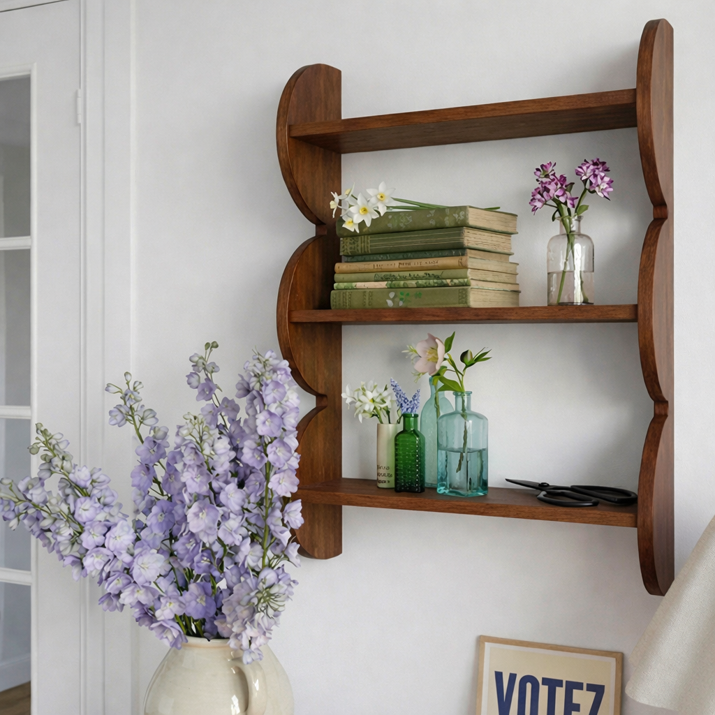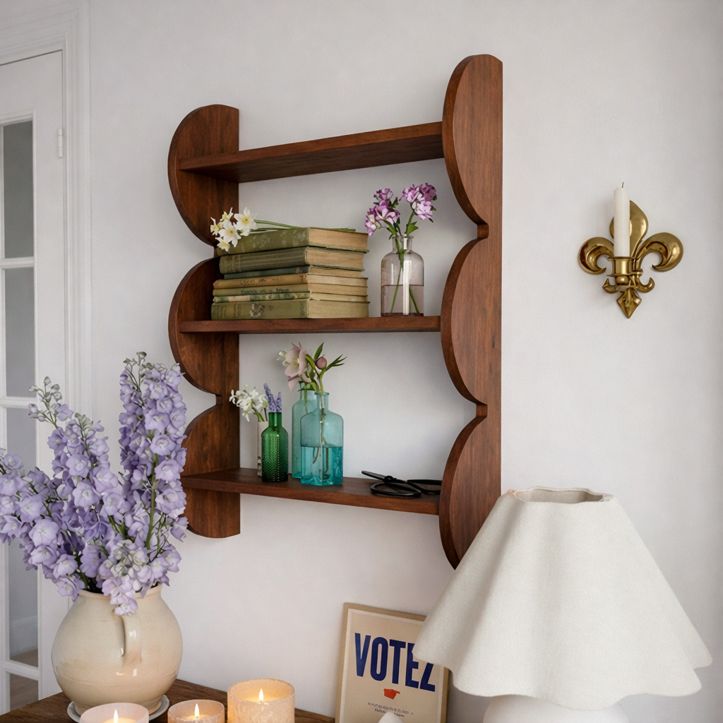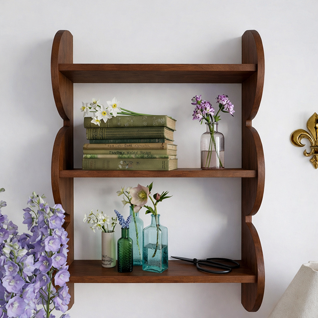 This Modern Natural Wood Wall Bookshelf With Curved Side Panels And Open Display Shelves features sculptural curved natural wood side panels that frame the piece and add a soft, decorative outline. The open shelf layout keeps items visible and accessible, making it simple to style stacked books, vases, candles, or small collections in a neat, intentional way. Its wall-mounted format helps free up floor space while adding a clean focal point.