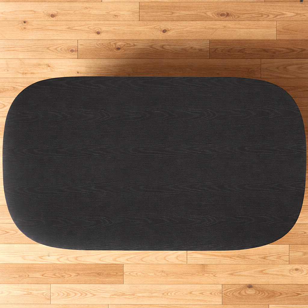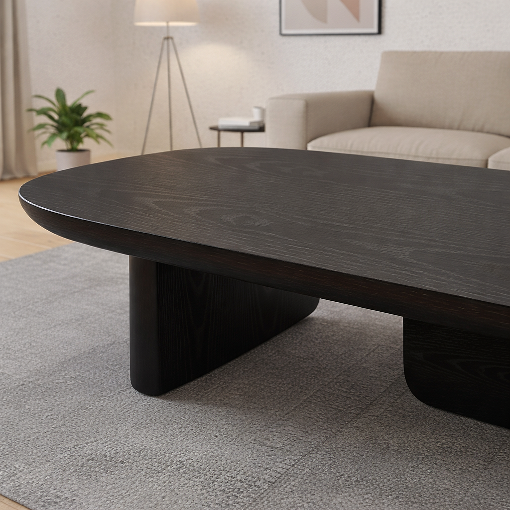 This coffee table features an elongated oval top with softly rounded edges, creating a smooth and approachable silhouette that helps soften the overall layout of the room. The pedestal-style base adds a strong grounded presence beneath the surface, reinforcing the table’s balanced proportions while maintaining a clean and uncluttered profile. Its broad top provides practical space for books, trays, candles, or decorative accents, making it suitable for both everyday use and styled living areas. The dark finish enhances the sculptural quality of the piece, adding depth and contrast within interiors that feature layered neutral tones.