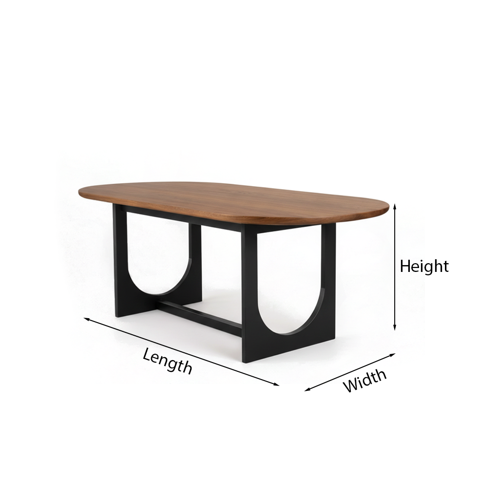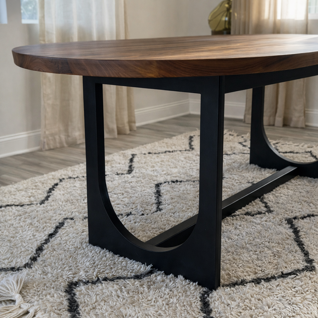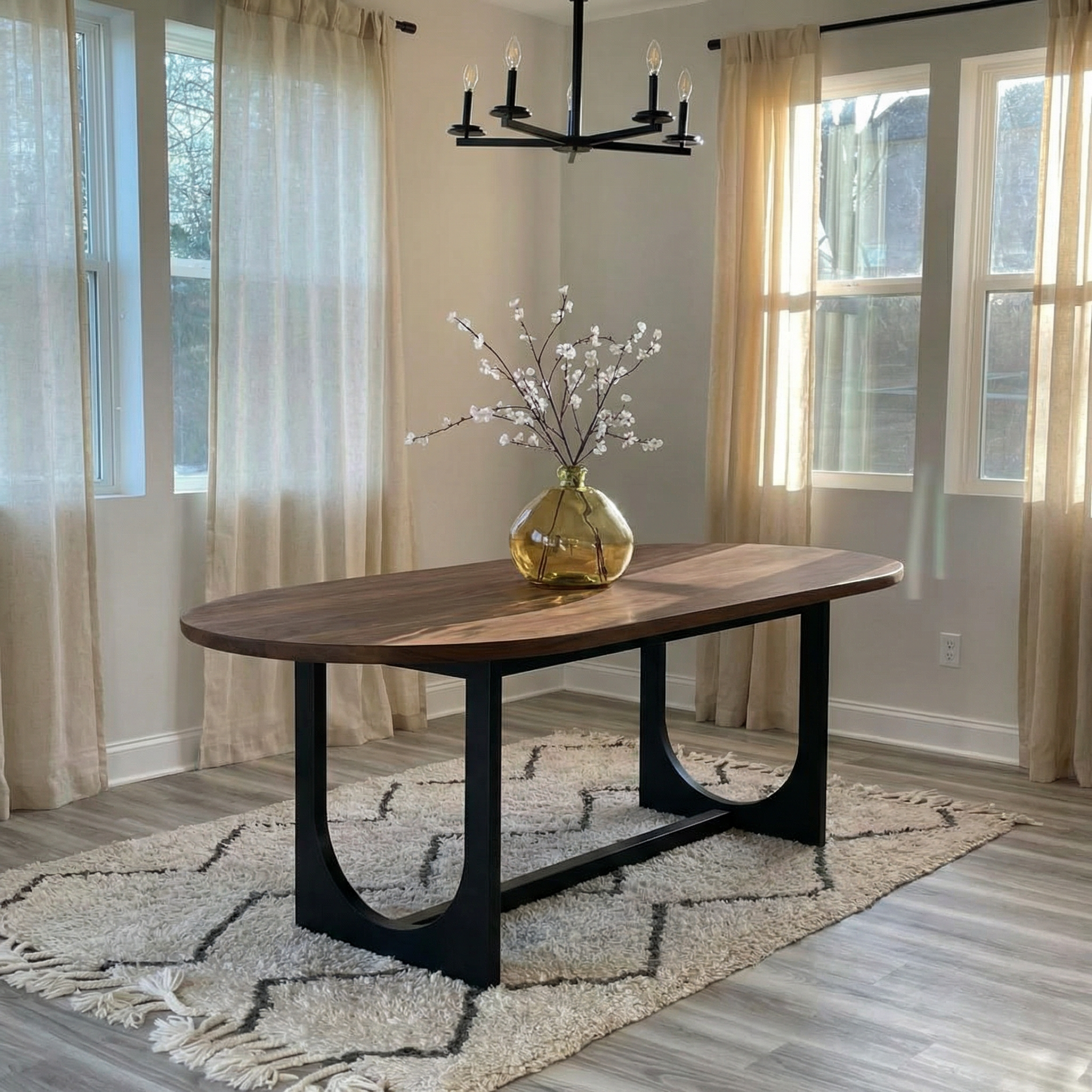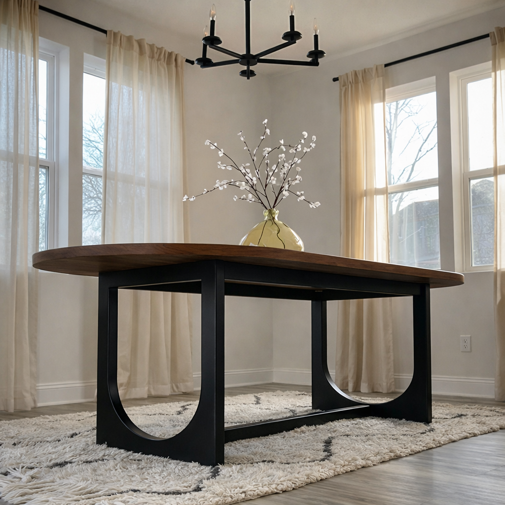 Add a touch of contemporary balance to your dining space with this modern oval natural wood dining table with black u shaped base for dining room. The elongated oval top brings warmth and softness to the room, while the contrasting base adds a bold architectural element that feels clean, modern, and grounded.