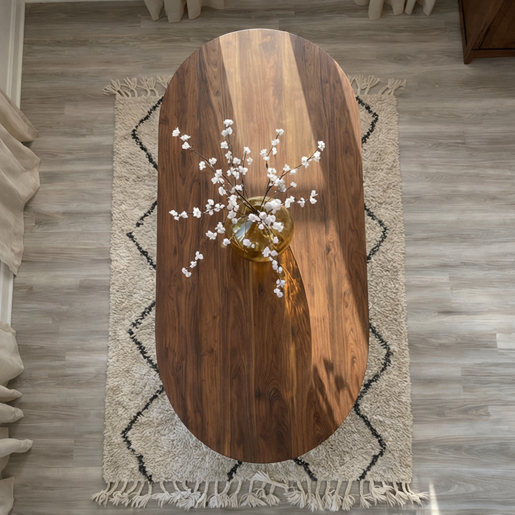 This dining table features an oval natural wood top with visible grain variation and rich tonal depth that give the surface a warm, inviting character. Its softened shape helps create a smoother visual flow in the room while offering a generous surface for place settings, serving pieces, and simple decorative styling.