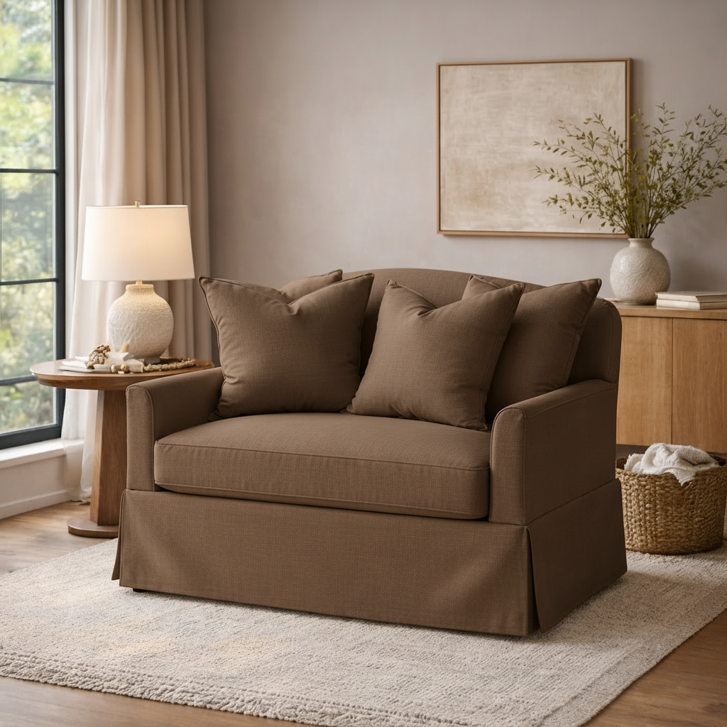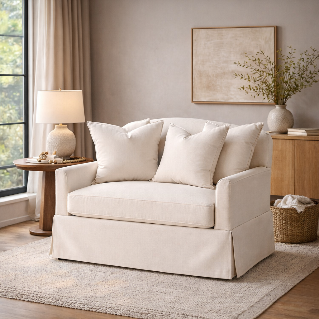 Modern Slipcovered Upholstered Armchair With Deep Seat And Removable Cushion For Living Room features a full slipcovered silhouette with gently rounded arms and a tailored skirt for a polished, lived-in finish. A deep seat and plush back pillows create a cozy setup for reading, relaxing, or casual conversation, while the neutral upholstery blends easily with minimalist, coastal, or transitional décor. The clean lines keep it feeling modern, and the structured shape helps it look refined even in everyday use.