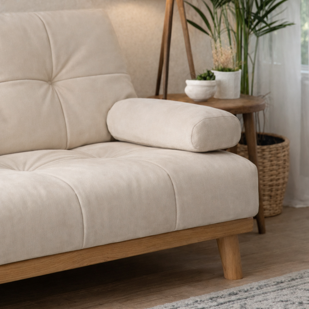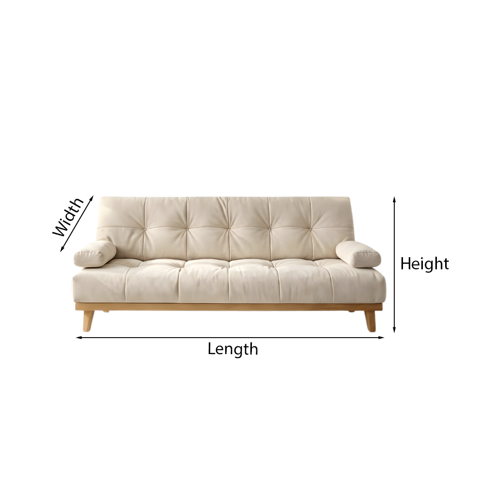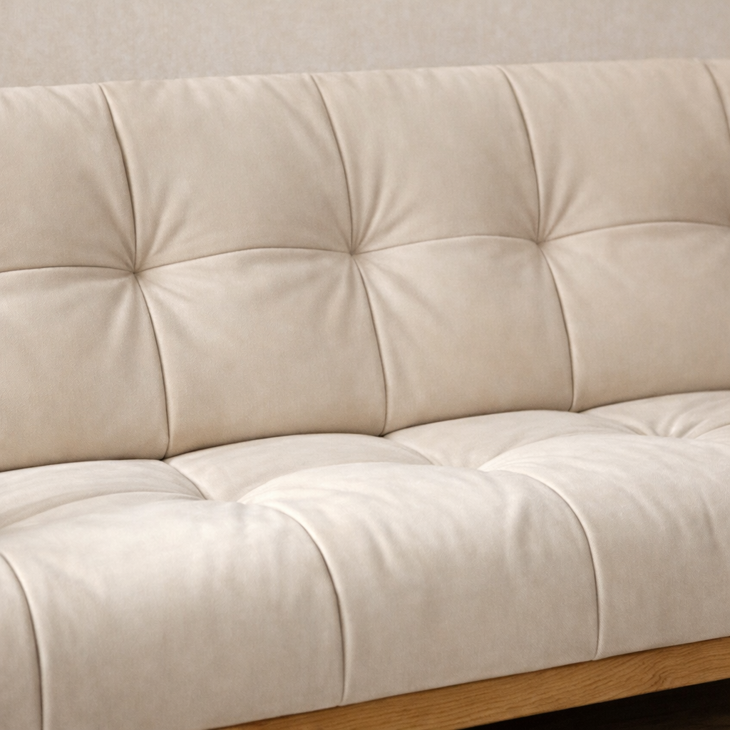 This sofa features a clean linear silhouette with generously padded seating, a tufted backrest, and softly cushioned arm pads that add both comfort and visual softness. The upholstered body creates a calm and inviting look, while the natural wood frame and tapered legs introduce natural warmth and a light supportive foundation. Its balanced proportions make the piece feel substantial without appearing heavy, allowing it to work easily in open and softly styled spaces. The combination of tufted detailing, plush seating, and natural wood elements gives the sofa a refined yet approachable character for everyday living.
