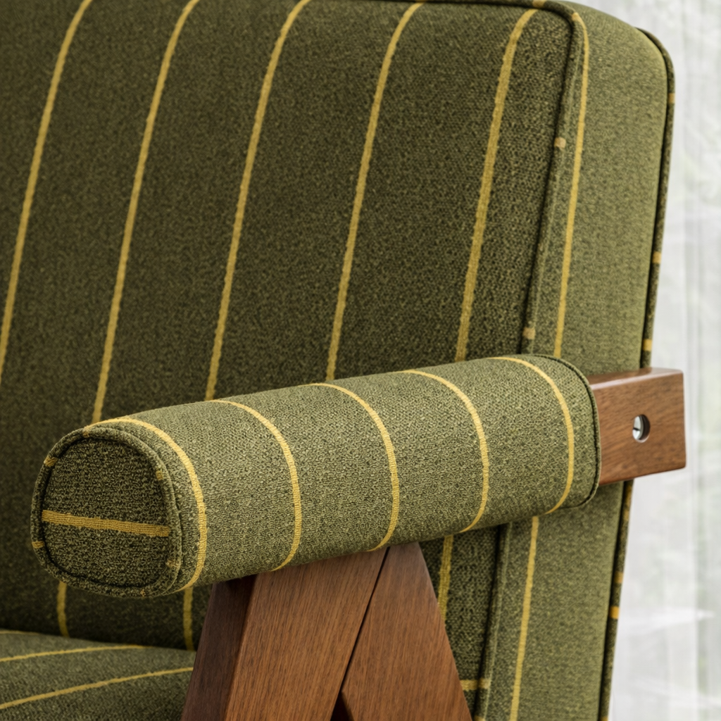 The generously cushioned seat and backrest offer supportive comfort for reading, conversation, or quiet relaxation. The natural wood frame ensures structural stability, while the slightly reclined back angle promotes a natural sitting posture.