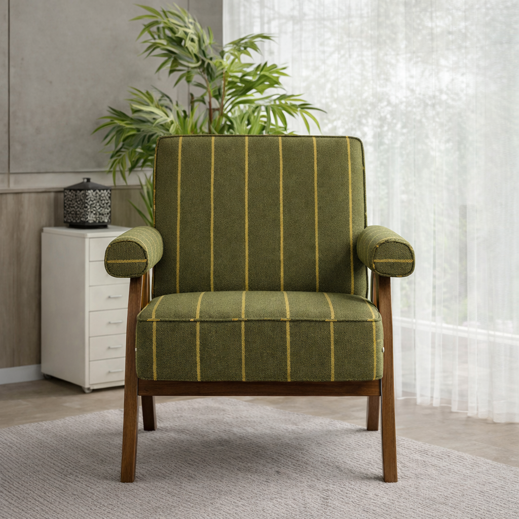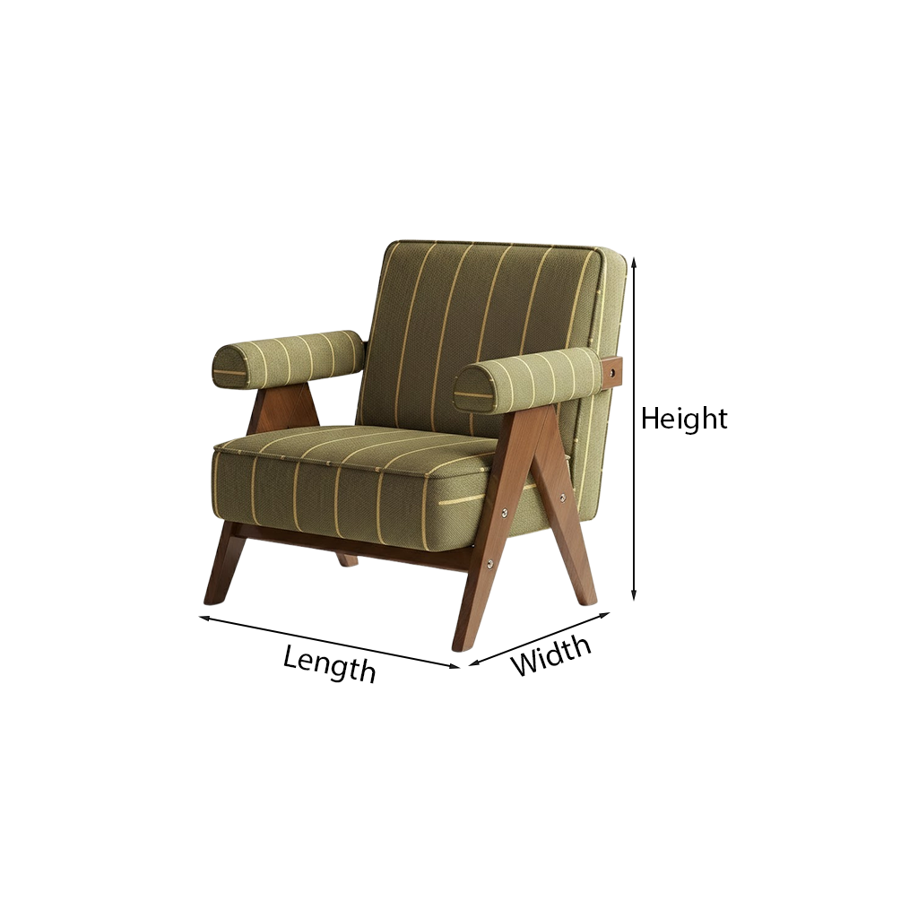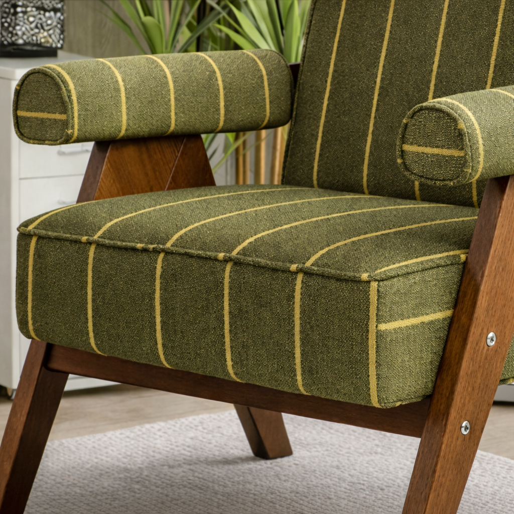 This modern natural wood accent chair for living room features a structured wood frame paired with vertically striped upholstery. The visible wood grain enhances the authenticity of natural wood while the patterned fabric introduces subtle visual rhythm.