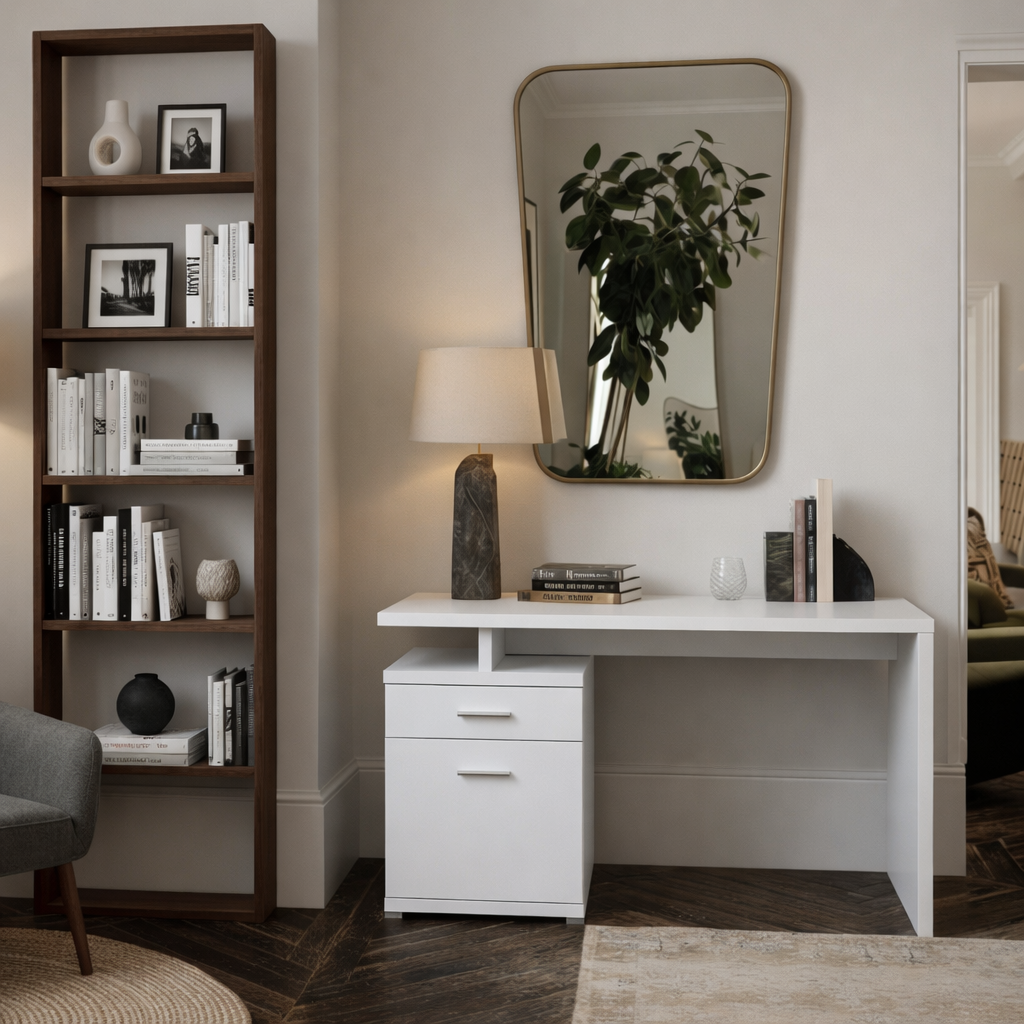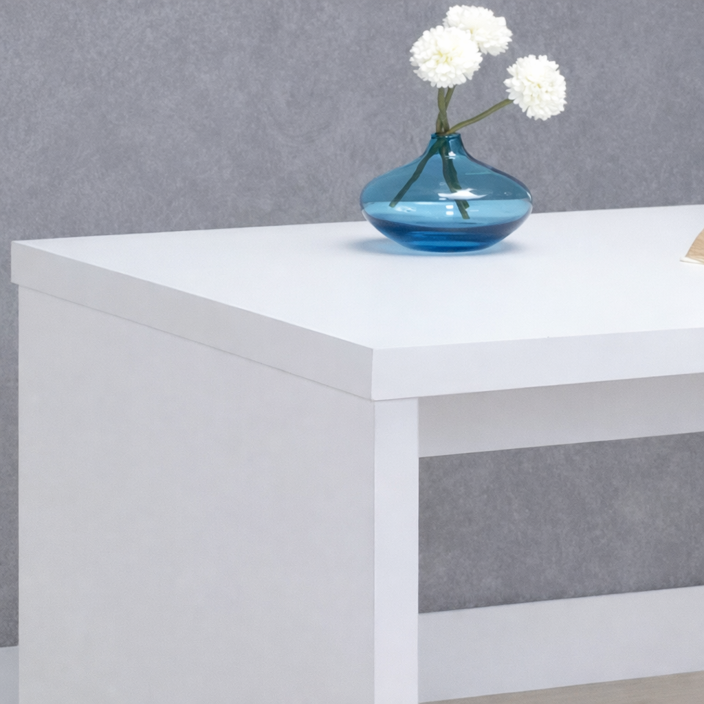 The crisp white finish paired with natural wood construction ensures durability while preserving a calm, refined aesthetic. Straight lines and a simple profile make this piece easy to style in modern interiors, supporting a focused and organized environment.