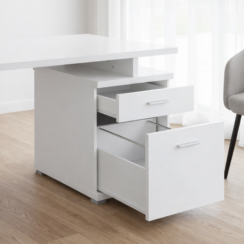 This modern white natural wood desk features a streamlined rectangular surface with a built in storage cabinet on one side for everyday essentials. Crafted from natural wood, it offers dependable stability while maintaining a clean, minimal presence in your workspace.
