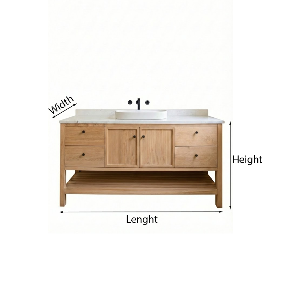 A spacious lower open shelf provides a convenient place for baskets, folded towels, or frequently used items, helping you keep the countertop clear. The warm wood tone and visible grain bring natural depth that pairs well with bright tile, neutral walls, and modern fixtures.