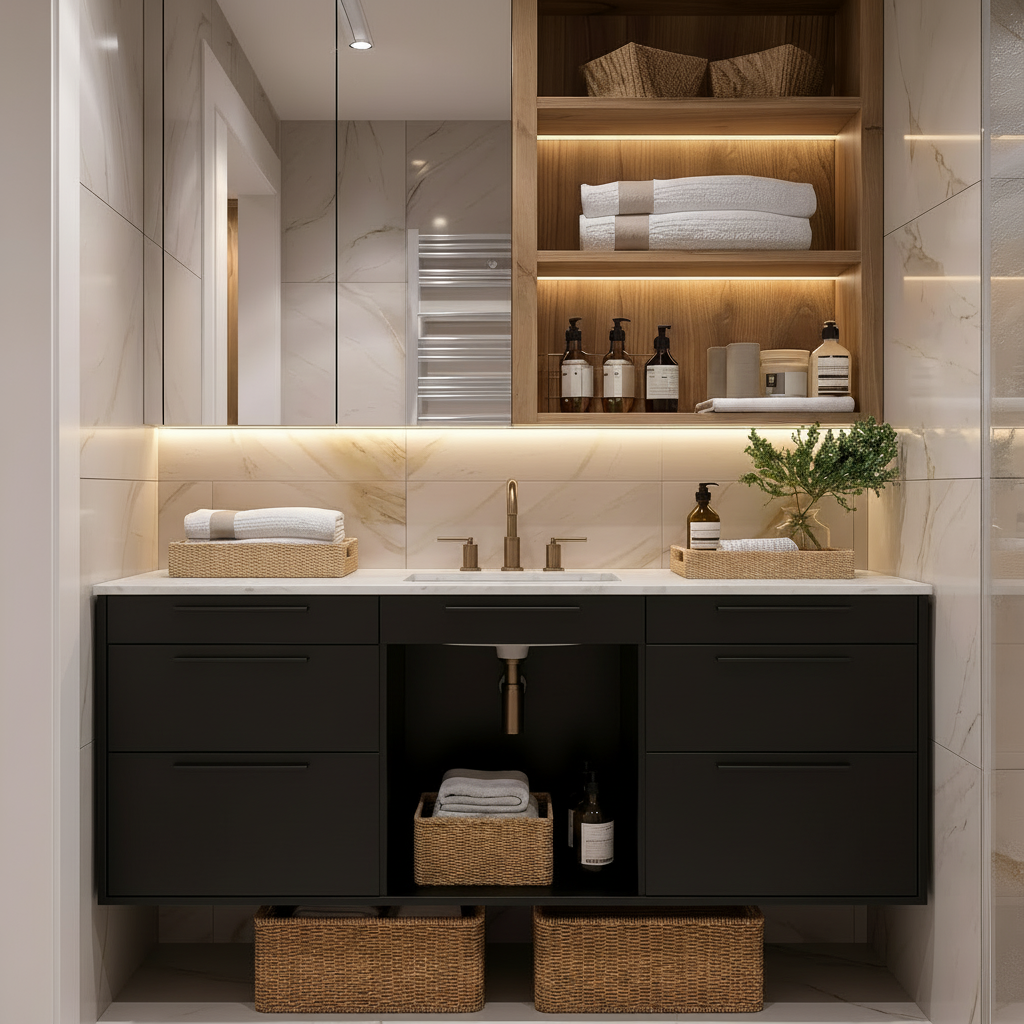 - Primary bathrooms that need a tidy countertop and hidden storage