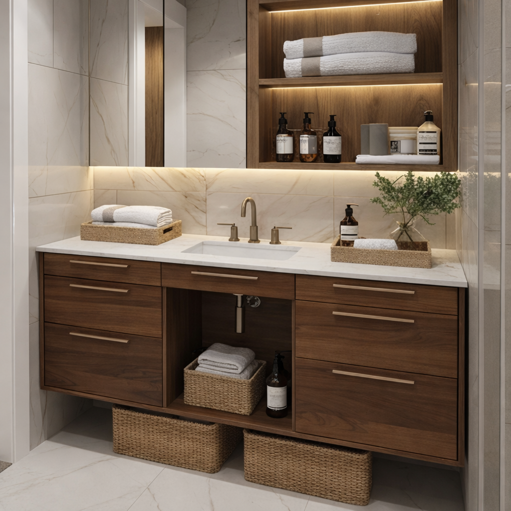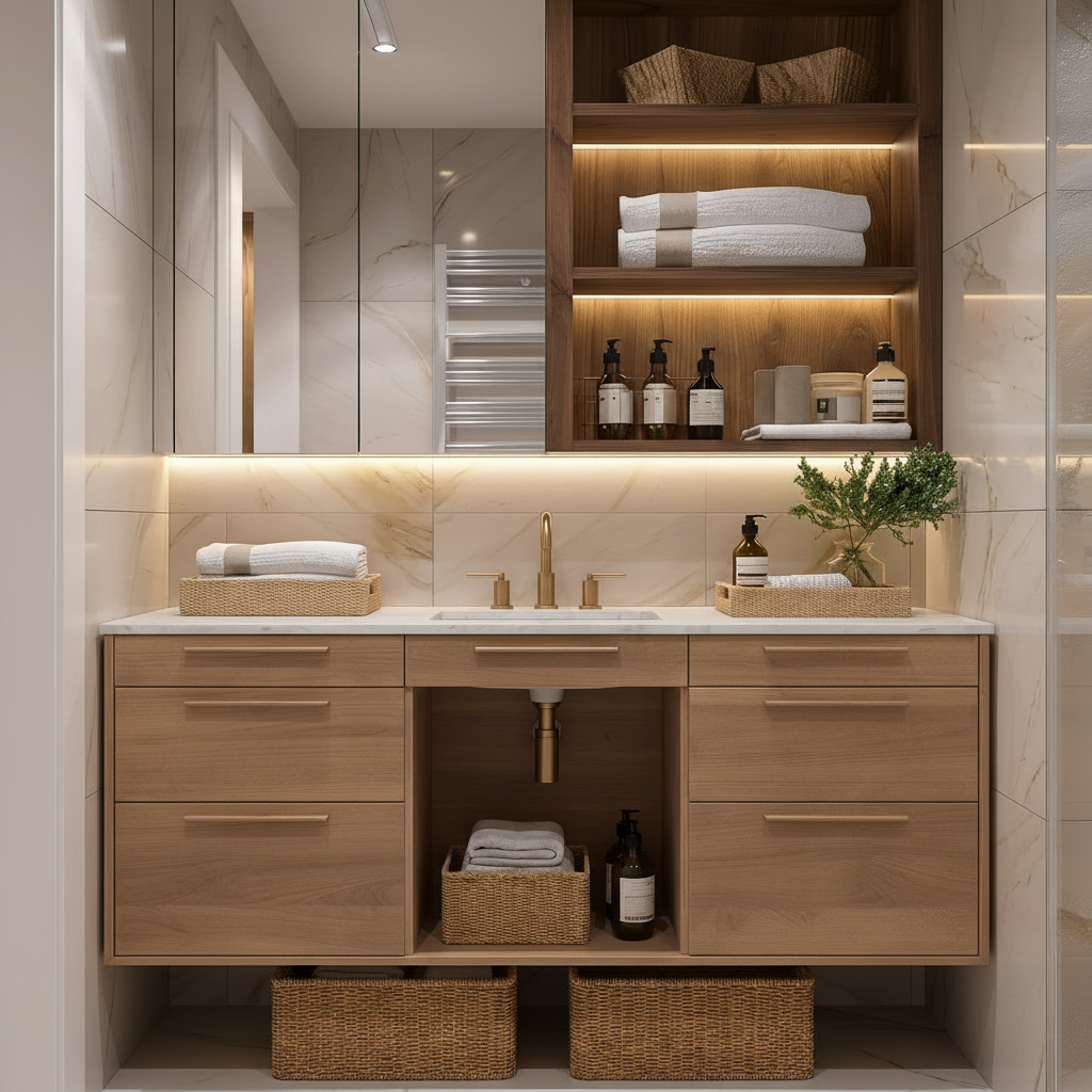 - Modern or minimalist bathrooms styled with warm wood tones and neutral finishes