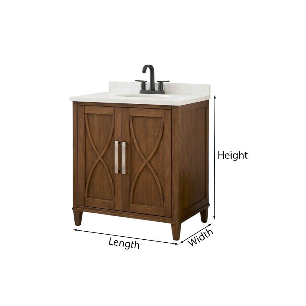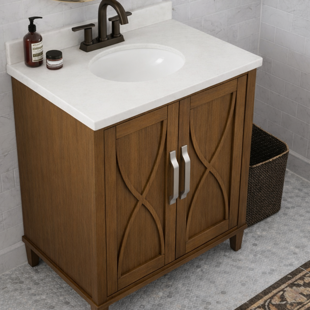 Create a warm and organized bathroom setting with this modern wooden bathroom vanity with white countertop and two door storage for bathroom. The clean rectangular silhouette, rich wood tone, and contrasting white surface bring a balanced modern look while offering practical storage for towels, toiletries, and everyday essentials.