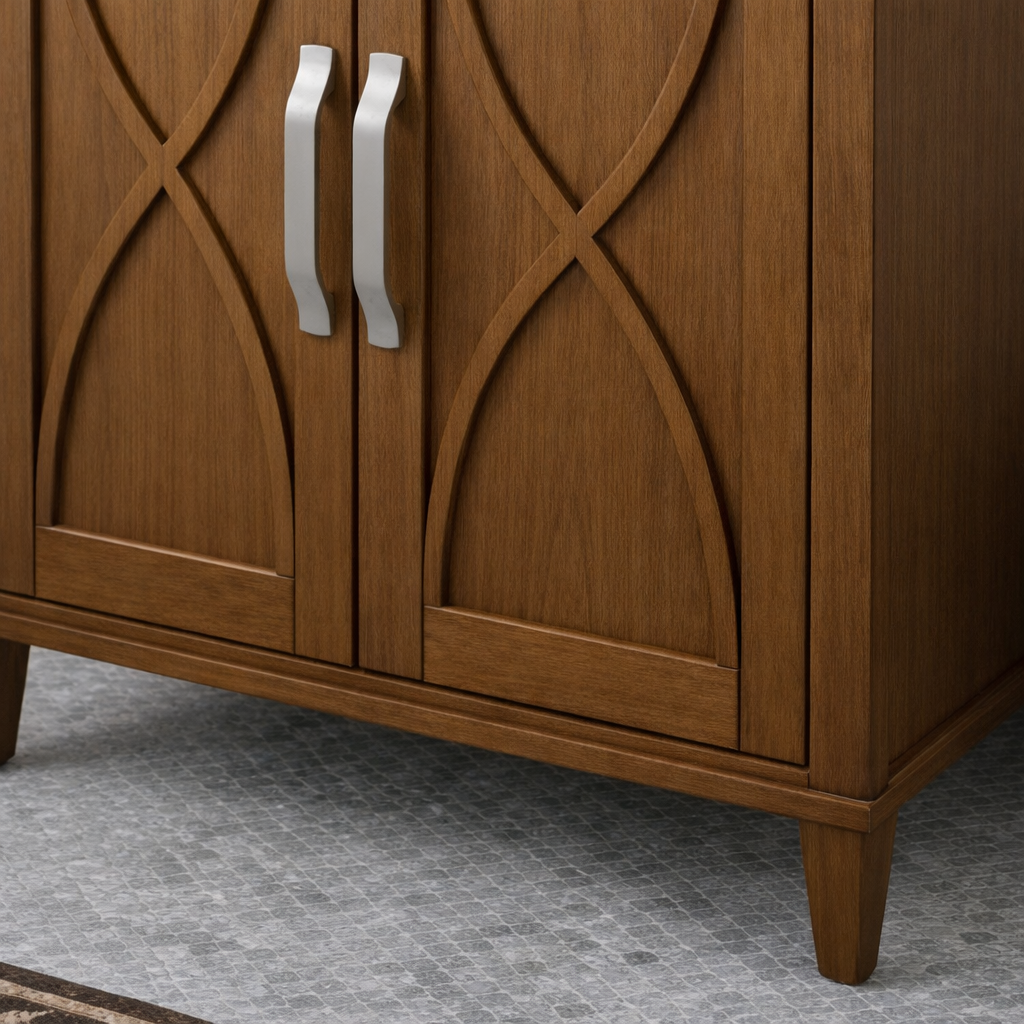 Two front cabinet doors open to reveal enclosed interior storage with divided compartments that help keep bathroom essentials neatly arranged. The paneled door fronts add subtle visual detail, while the tapered legs and streamlined hardware give the piece a refined look that feels modern yet approachable.