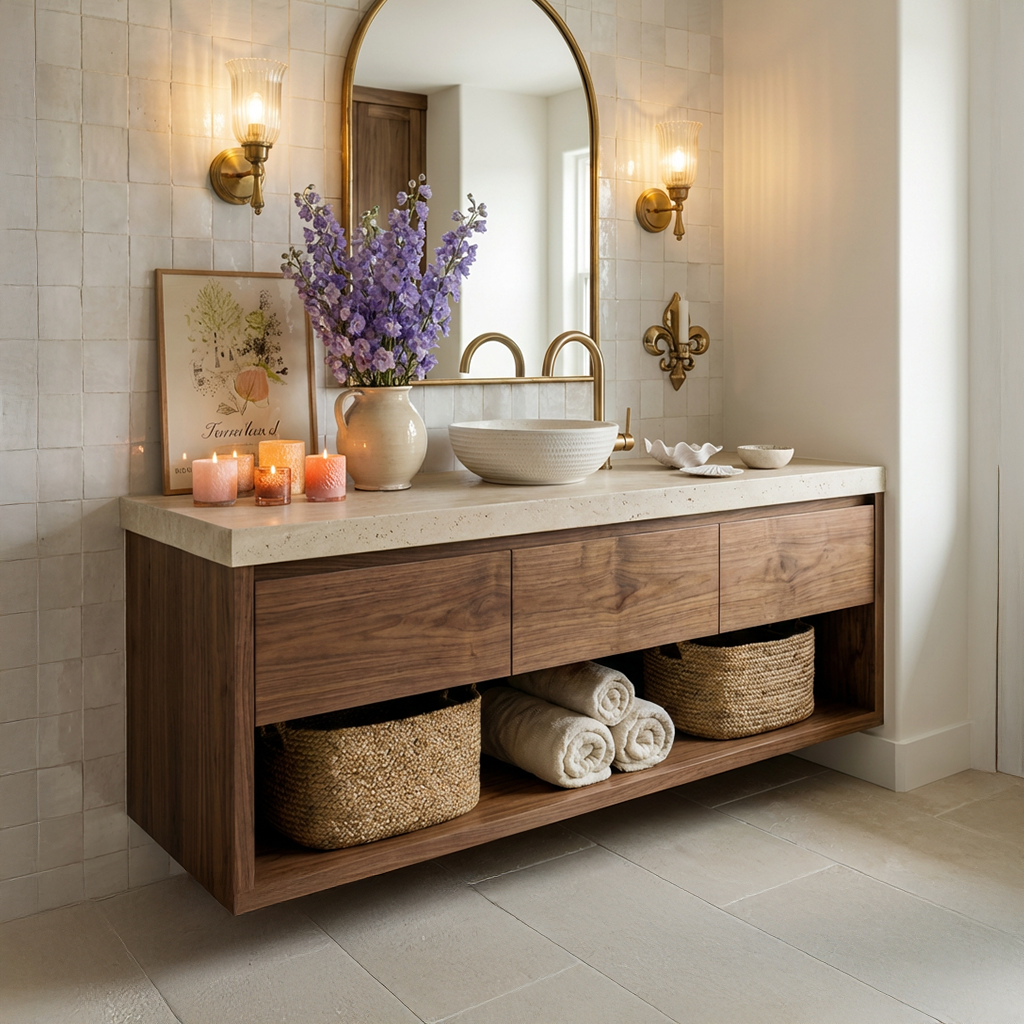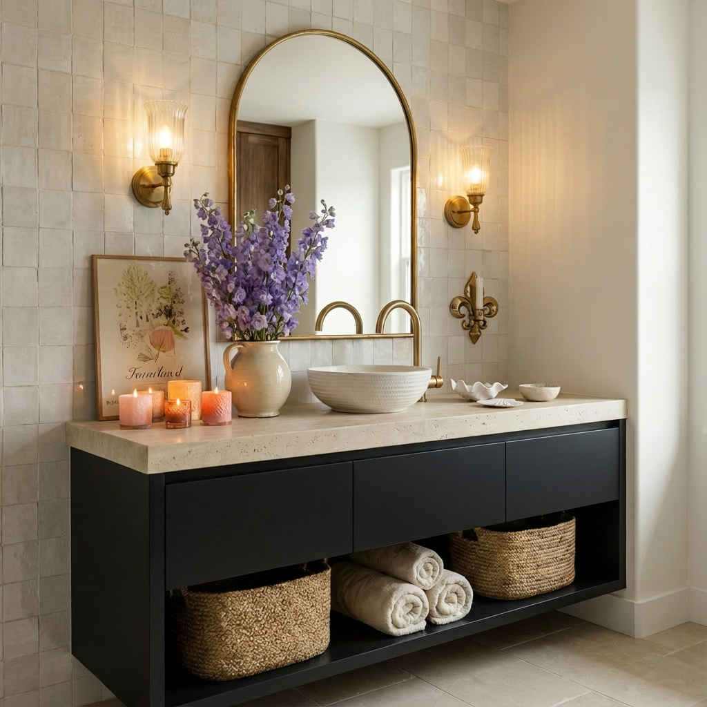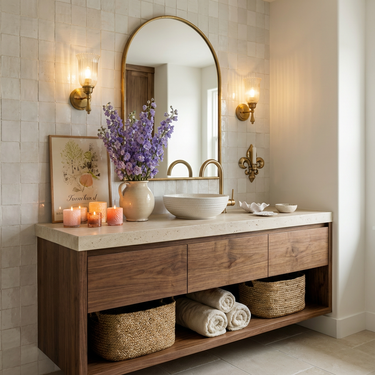 - Spa-inspired bathrooms with neutral textures and soft lighting
