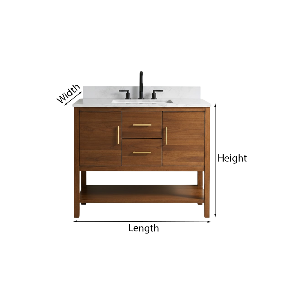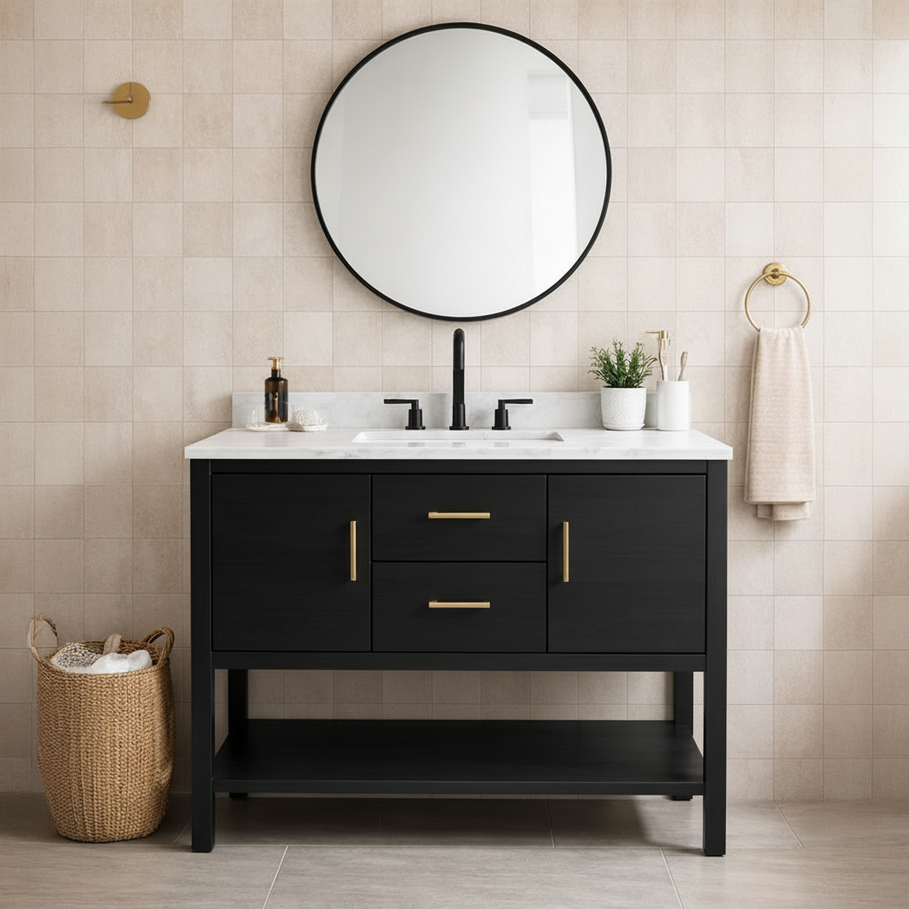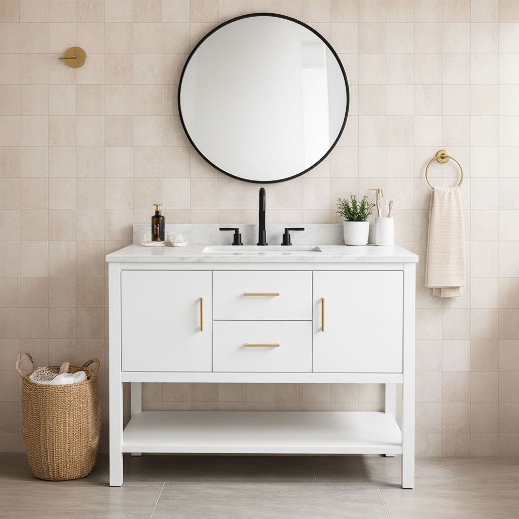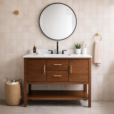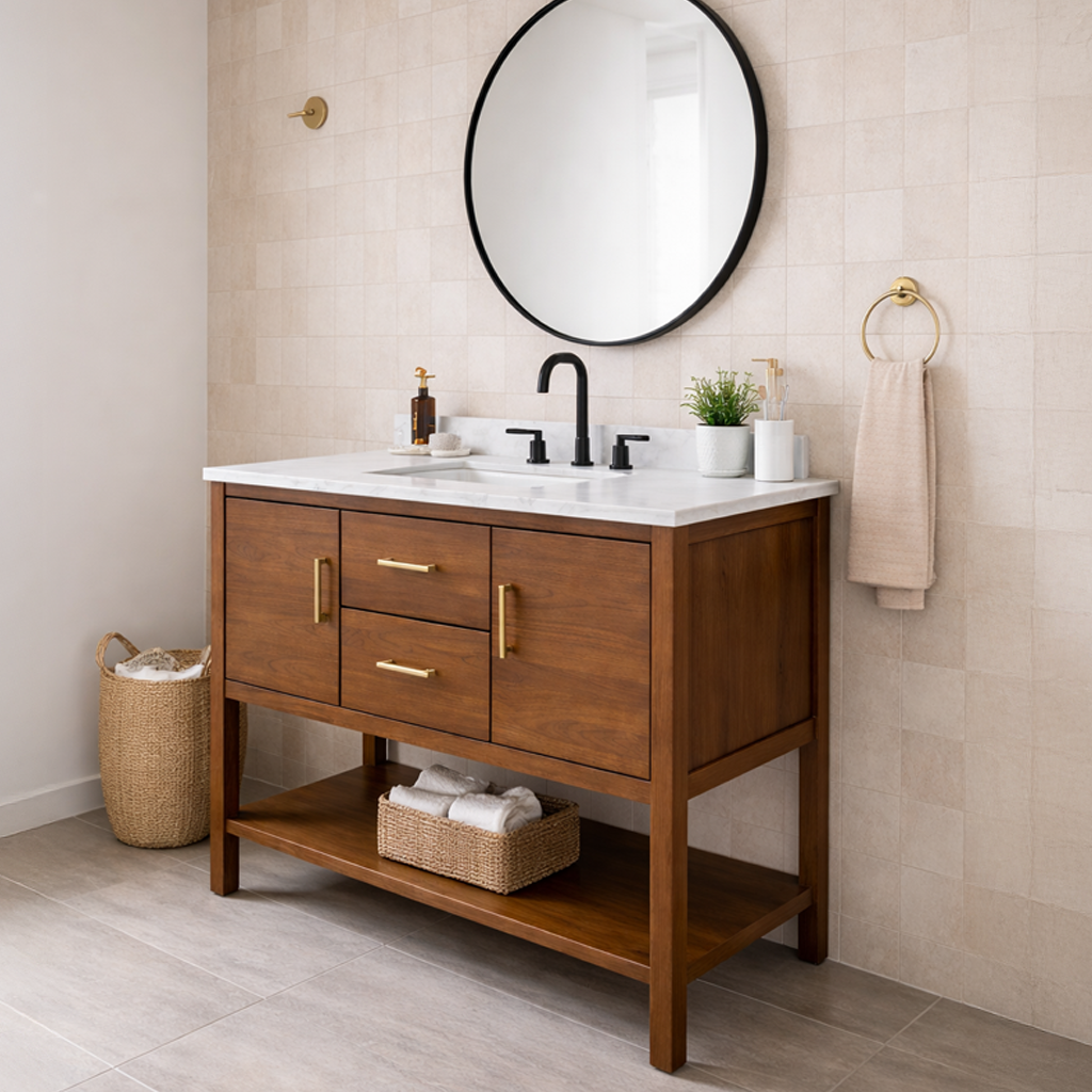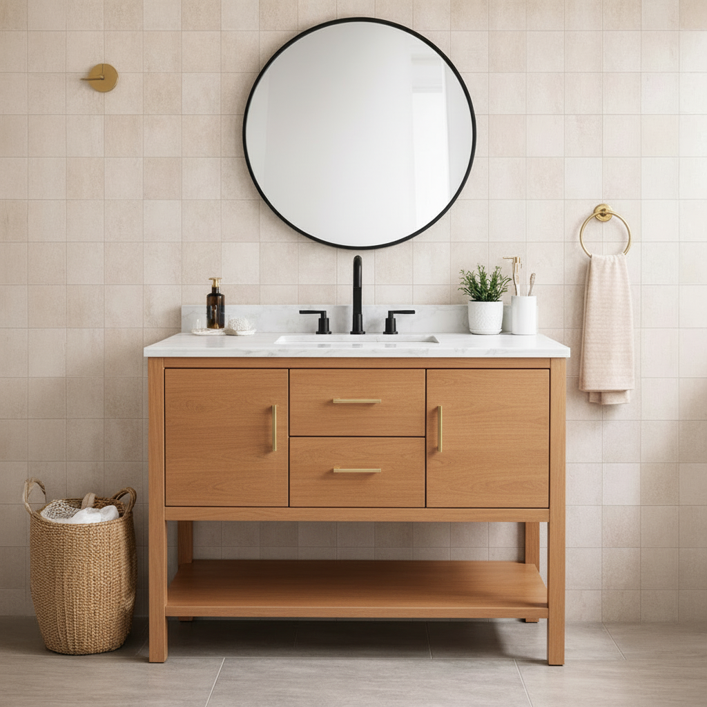 This Modern Wooden Freestanding Bathroom Vanity With Mixed Storage For Bathroom features a streamlined wooden base with a clean front profile that suits modern interiors. The integrated storage provides enclosed space to keep toiletries, skincare, and daily essentials neatly tucked away, while an open lower shelf offers flexible room for baskets or frequently used items. Its grounded silhouette pairs naturally with neutral tile, soft lighting, and understated bathroom styling.