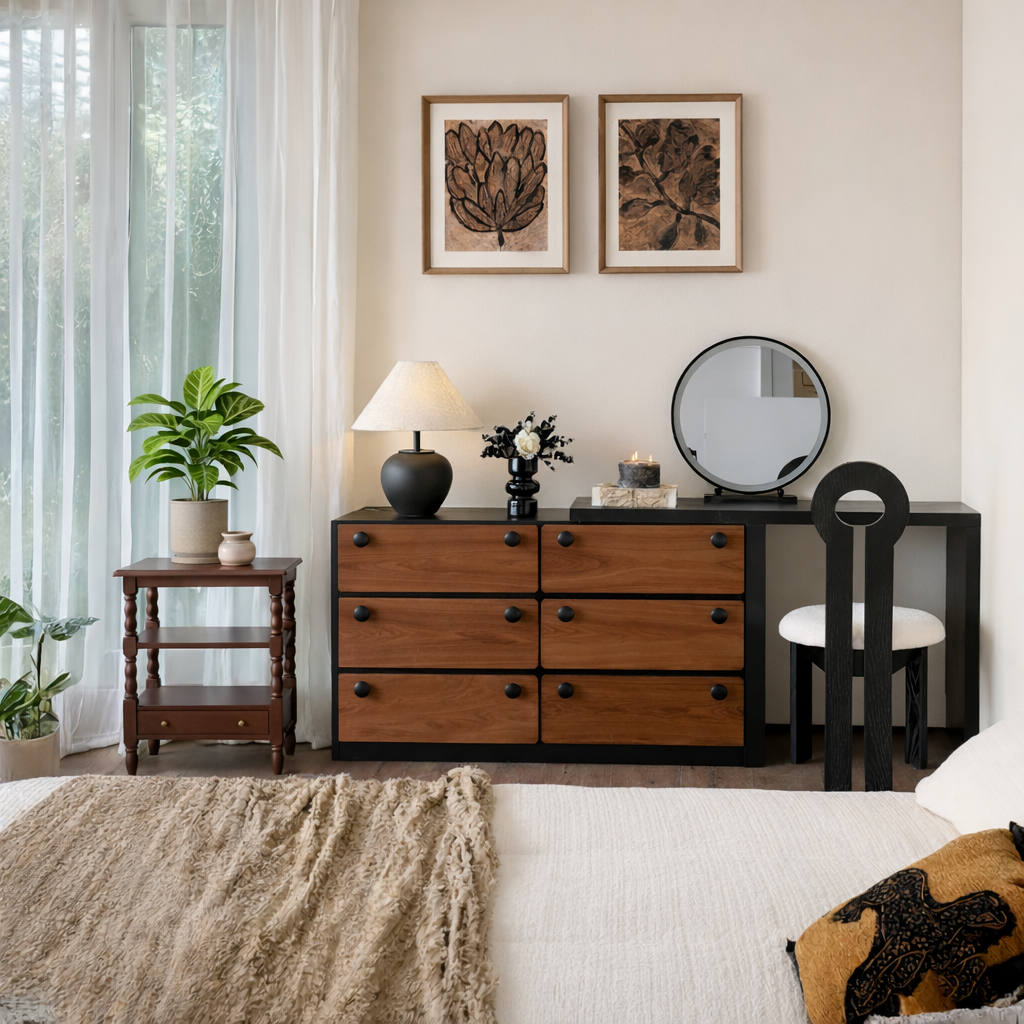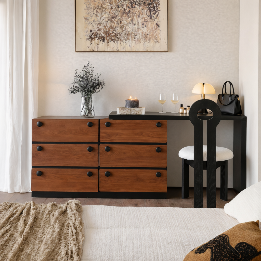 The smooth, clean lines and integrated design make this vanity a versatile addition to any bedroom or dressing area. The wooden drawers beautifully contrast with the bold black frame, making it both a functional and visually striking piece.