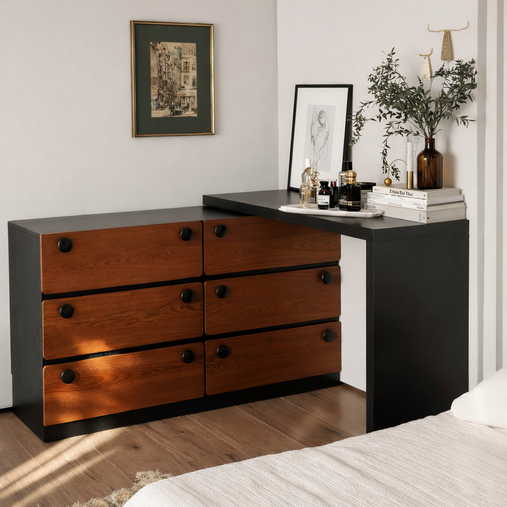 This makeup vanity features six roomy drawers crafted from rich wood, ideal for storing makeup, accessories, and beauty essentials. The black frame and minimalist design add a contemporary touch, while the floating desk section creates an elegant workspace for applying makeup or organizing your items.