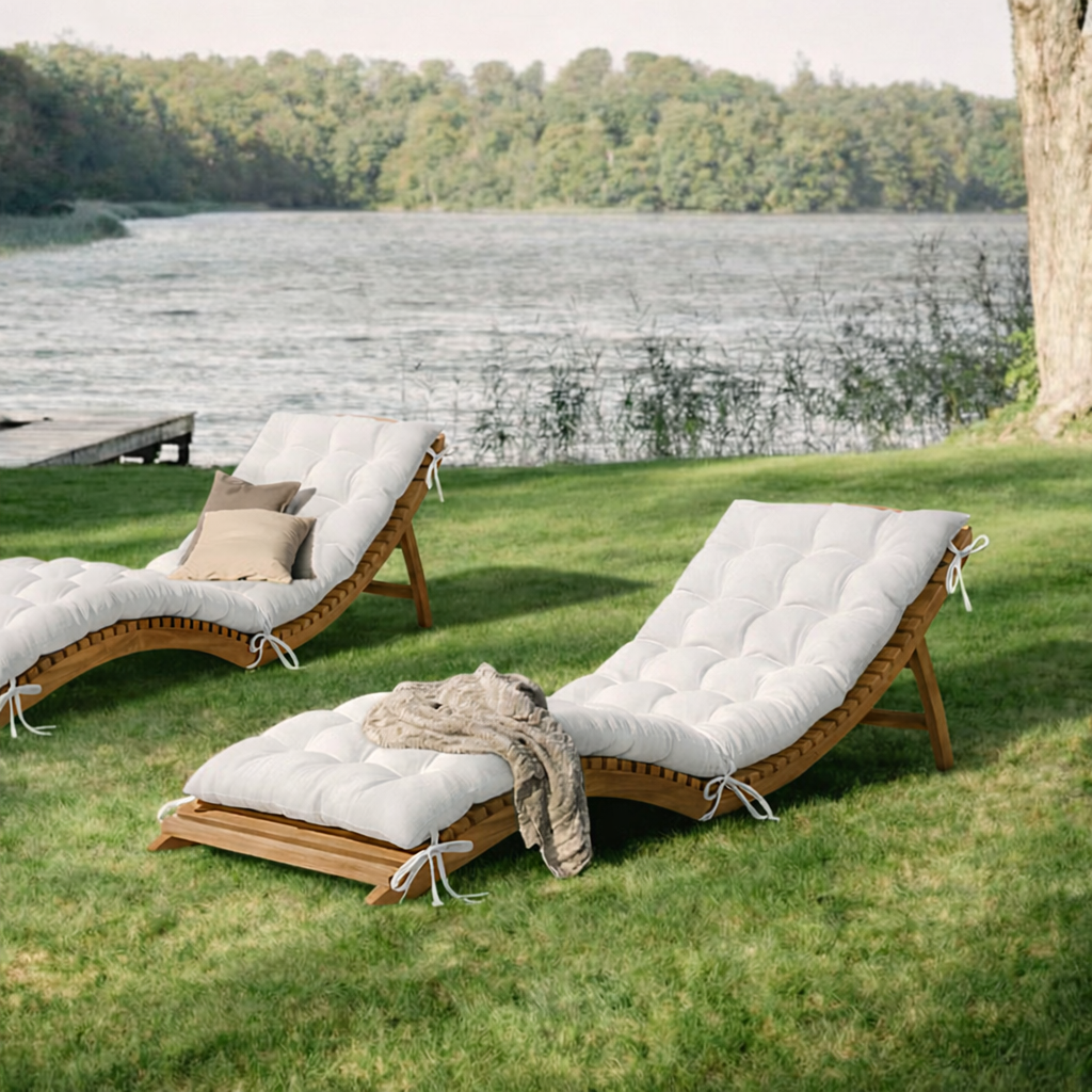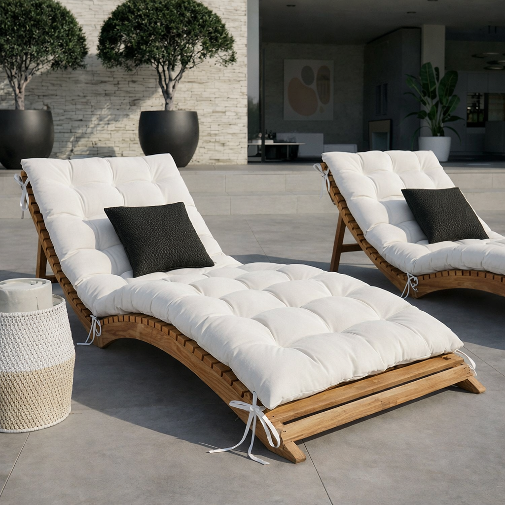 This Modern Wooden Outdoor Lounge Chair With Slatted Base And Cushioned Seat features a smooth, flowing frame with a slatted wooden base that adds subtle texture and natural rhythm to the design. The contoured silhouette supports a comfortable reclining position, while the padded cushion provides a soft surface for lounging by the pool or terrace. The combination of clean lines and layered materials creates a balanced, modern outdoor presence.