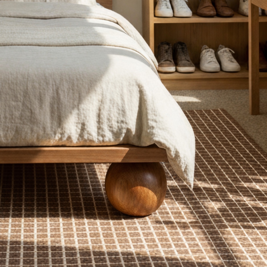 This bed showcases a clean wooden platform frame with a low profile that keeps the room feeling open and airy. The rounded ball legs create a distinctive base detail while supporting a stable, balanced structure. A simple headboard completes the look, offering an understated backdrop for bedding and pillows without visual clutter.